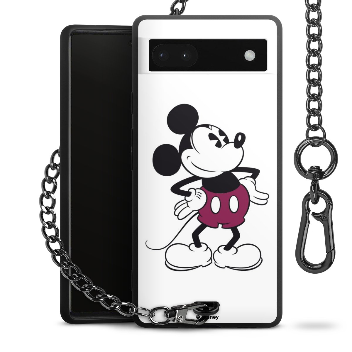 Die Handyhülle verfügt über eine mittig am unteren Rand platzierte Öse, an der die Metallkette stabil befestigt ist. Bestelle die Hülle einfach für Dein Smartphone-Modell, dann passt sie wie angegossen und Du brauchst sie bloß einmal anzudrücken. Handy in die Tasche, Karabiner an den Hosenbund – schon kann die Party starten.