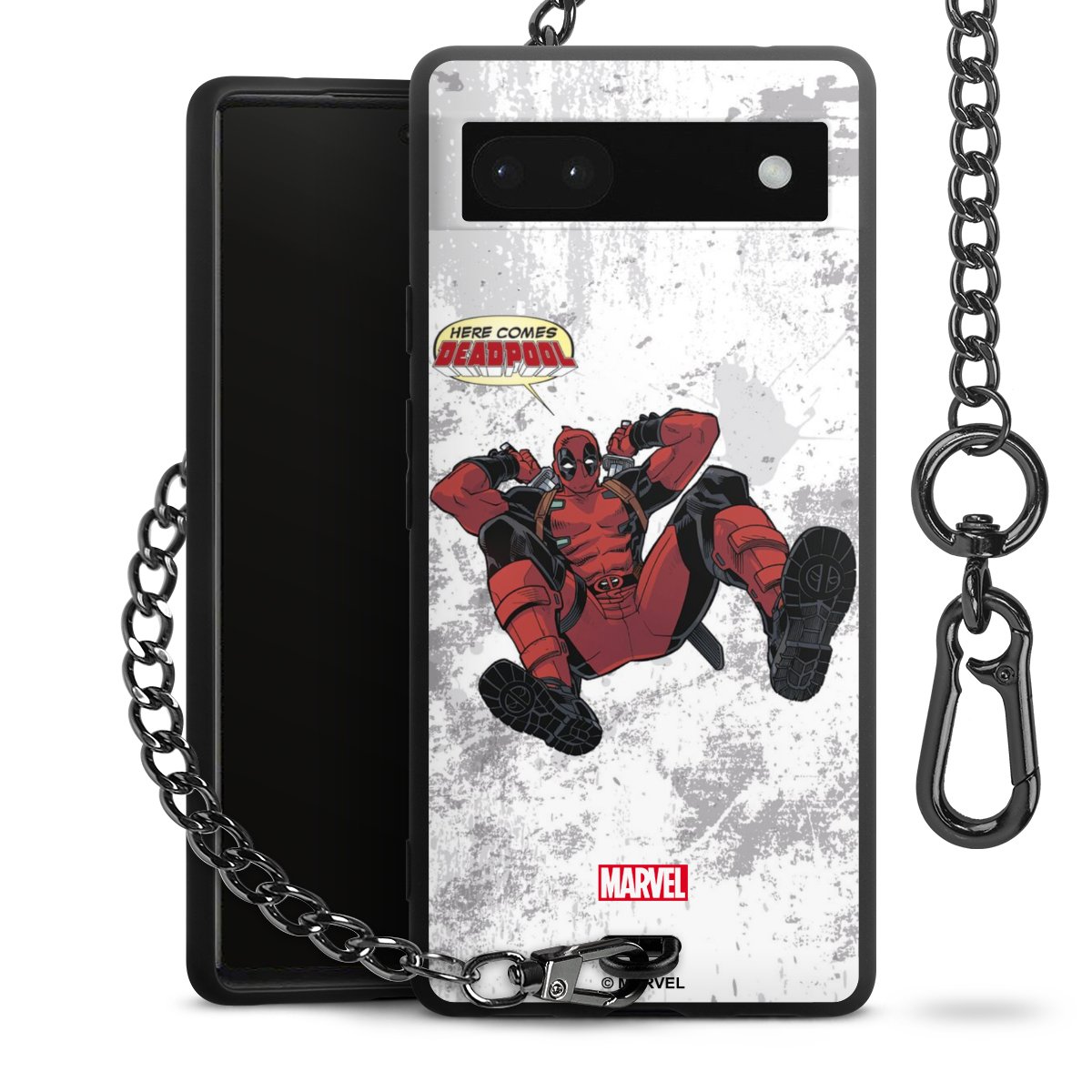 Die mattschwarze Silikon-Handyhülle besteht aus robustem TPU (thermoplastisches Polyurethan). Sie ist flexibel und schützt Dein Smartphone vor Stößen und Kratzern. Die Kette sowie der Karabinerhaken sind aus Metall in Gunmetal-Optik gefertigt. Für dieses Produkt kommen ausschließlich TÜV-geprüfte Materialien zum Einsatz.