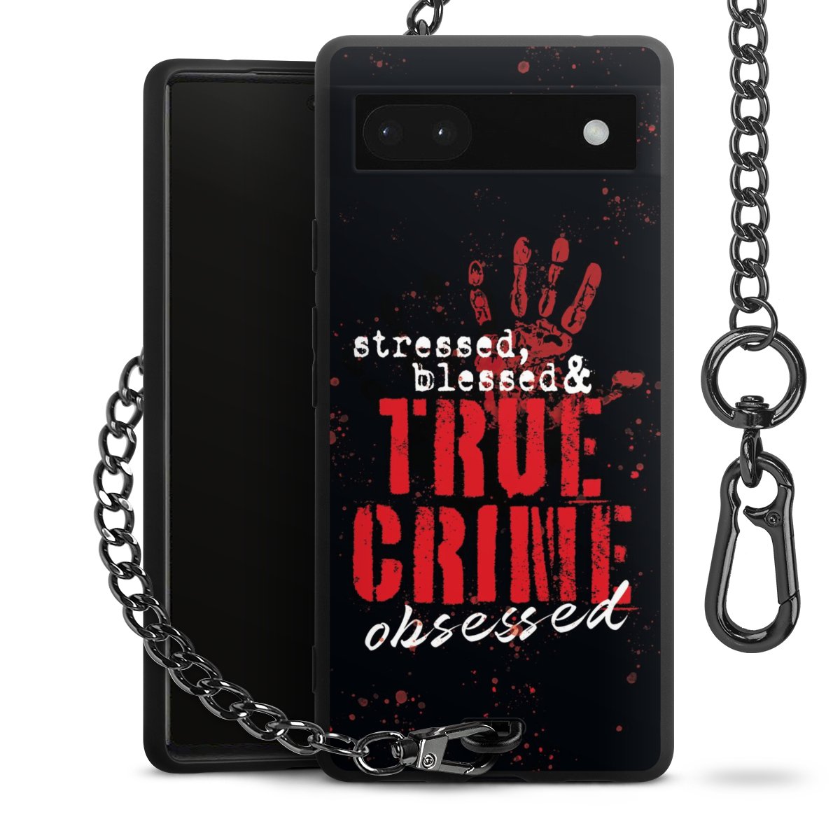 Die mattschwarze Silikon-Handyhülle besteht aus robustem TPU (thermoplastisches Polyurethan). Sie ist flexibel und schützt Dein Smartphone vor Stößen und Kratzern. Die Kette sowie der Karabinerhaken sind aus Metall in Gunmetal-Optik gefertigt. Für dieses Produkt kommen ausschließlich TÜV-geprüfte Materialien zum Einsatz.