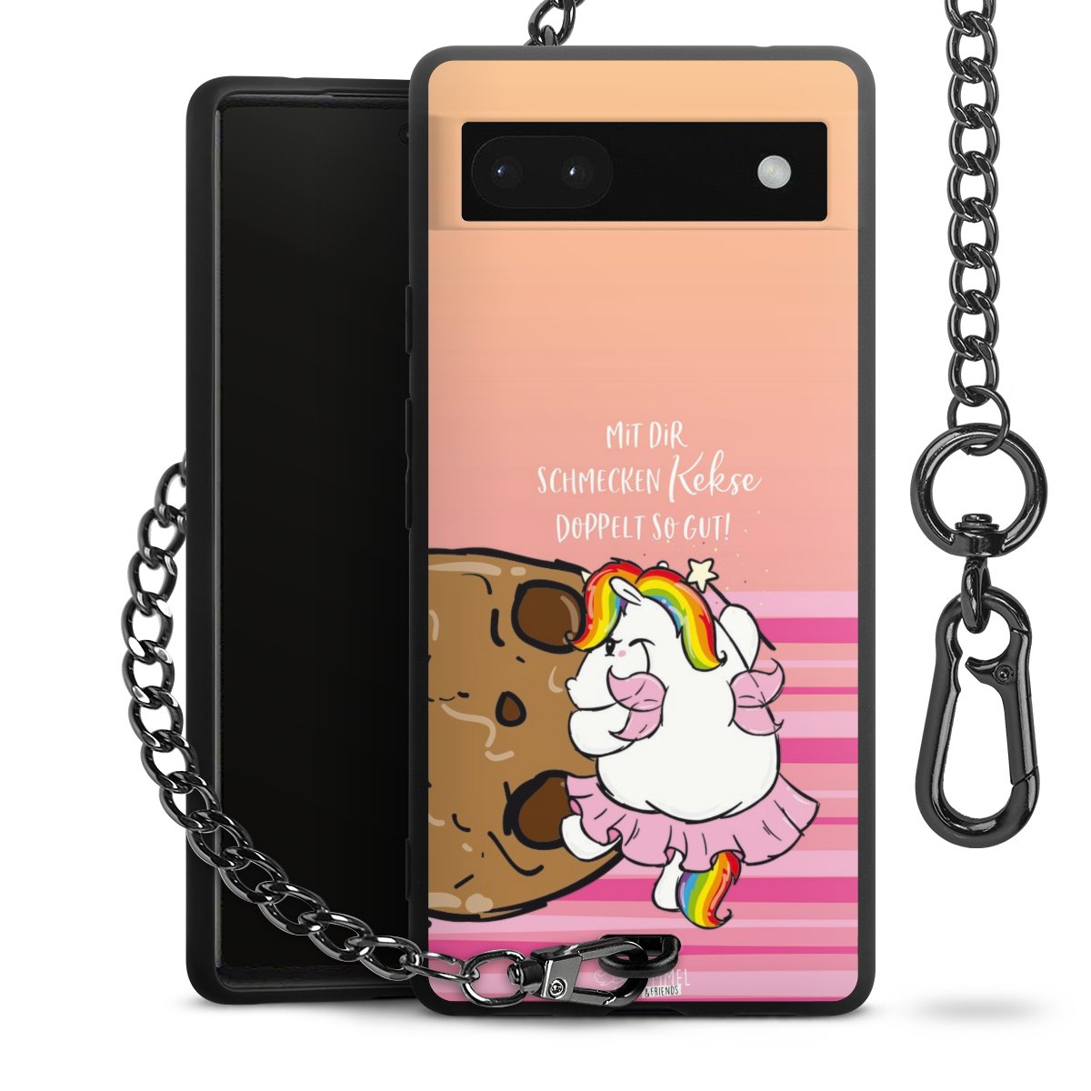 Die mattschwarze Silikon-Handyhülle besteht aus robustem TPU (thermoplastisches Polyurethan). Sie ist flexibel und schützt Dein Smartphone vor Stößen und Kratzern. Die Kette sowie der Karabinerhaken sind aus Metall in Gunmetal-Optik gefertigt. Für dieses Produkt kommen ausschließlich TÜV-geprüfte Materialien zum Einsatz.
