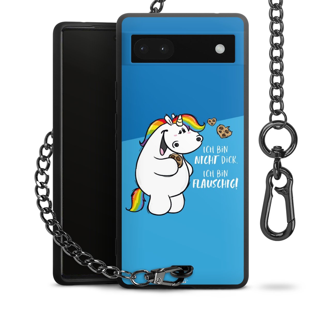 Die mattschwarze Silikon-Handyhülle besteht aus robustem TPU (thermoplastisches Polyurethan). Sie ist flexibel und schützt Dein Smartphone vor Stößen und Kratzern. Die Kette sowie der Karabinerhaken sind aus Metall in Gunmetal-Optik gefertigt. Für dieses Produkt kommen ausschließlich TÜV-geprüfte Materialien zum Einsatz.