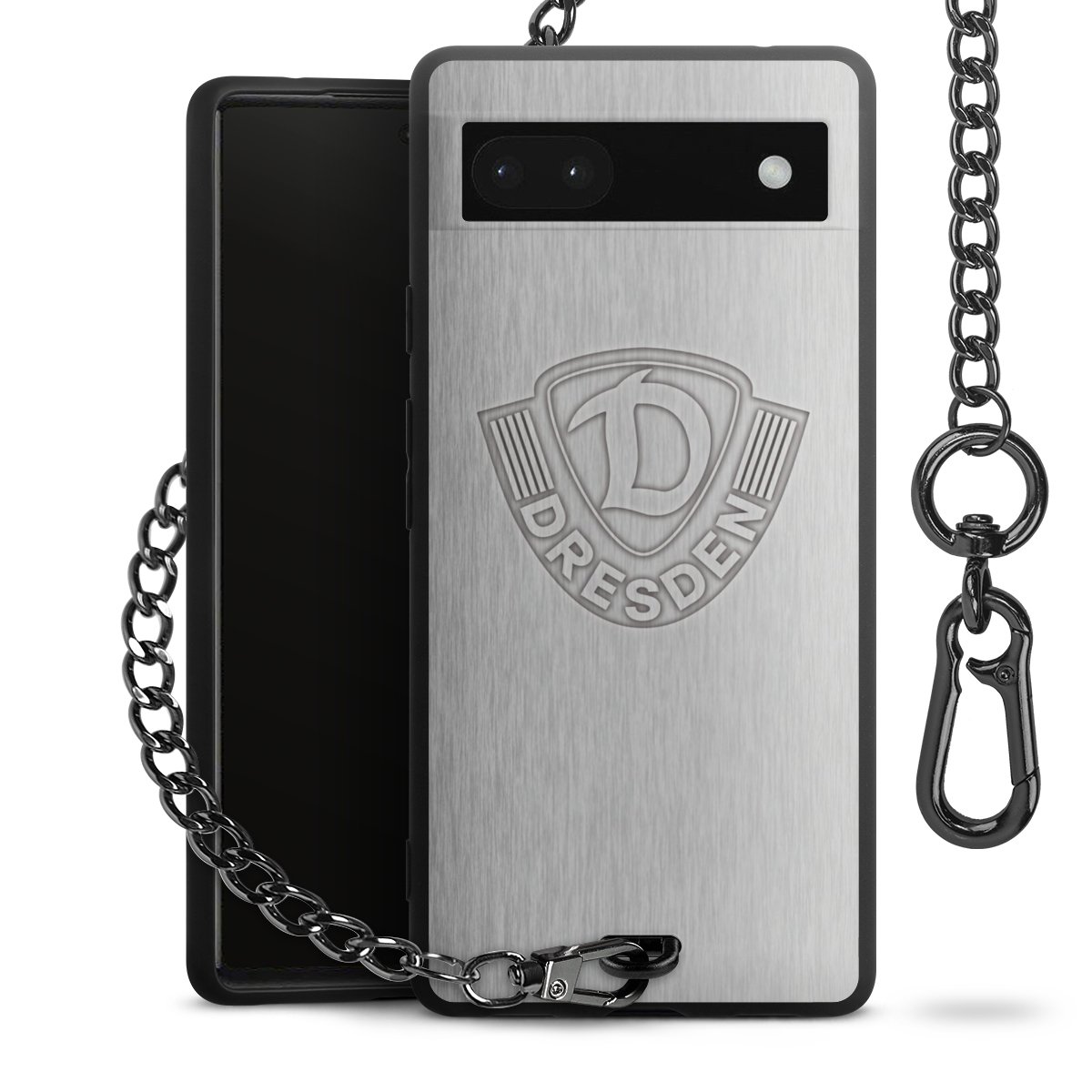 Die mattschwarze Silikon-Handyhülle besteht aus robustem TPU (thermoplastisches Polyurethan). Sie ist flexibel und schützt Dein Smartphone vor Stößen und Kratzern. Die Kette sowie der Karabinerhaken sind aus Metall in Gunmetal-Optik gefertigt. Für dieses Produkt kommen ausschließlich TÜV-geprüfte Materialien zum Einsatz.