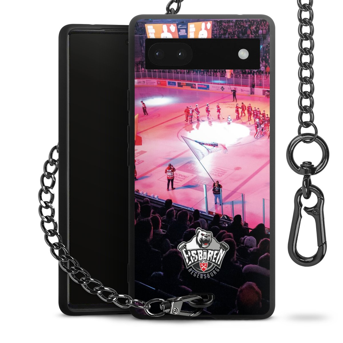 Die mattschwarze Silikon-Handyhülle besteht aus robustem TPU (thermoplastisches Polyurethan). Sie ist flexibel und schützt Dein Smartphone vor Stößen und Kratzern. Die Kette sowie der Karabinerhaken sind aus Metall in Gunmetal-Optik gefertigt. Für dieses Produkt kommen ausschließlich TÜV-geprüfte Materialien zum Einsatz.