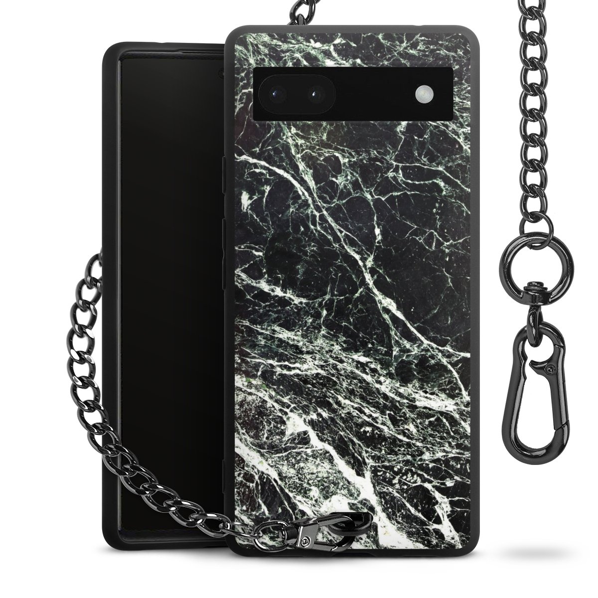 Die mattschwarze Silikon-Handyhülle besteht aus robustem TPU (thermoplastisches Polyurethan). Sie ist flexibel und schützt Dein Smartphone vor Stößen und Kratzern. Die Kette sowie der Karabinerhaken sind aus Metall in Gunmetal-Optik gefertigt. Für dieses Produkt kommen ausschließlich TÜV-geprüfte Materialien zum Einsatz.