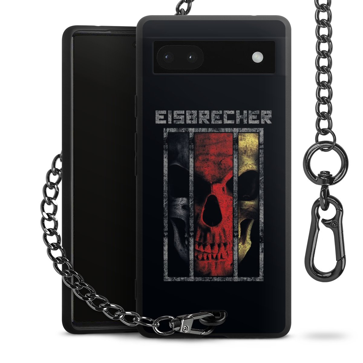 Die mattschwarze Silikon-Handyhülle besteht aus robustem TPU (thermoplastisches Polyurethan). Sie ist flexibel und schützt Dein Smartphone vor Stößen und Kratzern. Die Kette sowie der Karabinerhaken sind aus Metall in Gunmetal-Optik gefertigt. Für dieses Produkt kommen ausschließlich TÜV-geprüfte Materialien zum Einsatz.