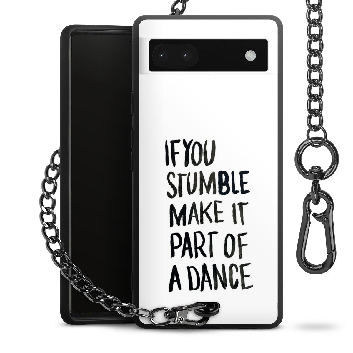 Die mattschwarze Silikon-Handyhülle besteht aus robustem TPU (thermoplastisches Polyurethan). Sie ist flexibel und schützt Dein Smartphone vor Stößen und Kratzern. Die Kette sowie der Karabinerhaken sind aus Metall in Gunmetal-Optik gefertigt. Für dieses Produkt kommen ausschließlich TÜV-geprüfte Materialien zum Einsatz.