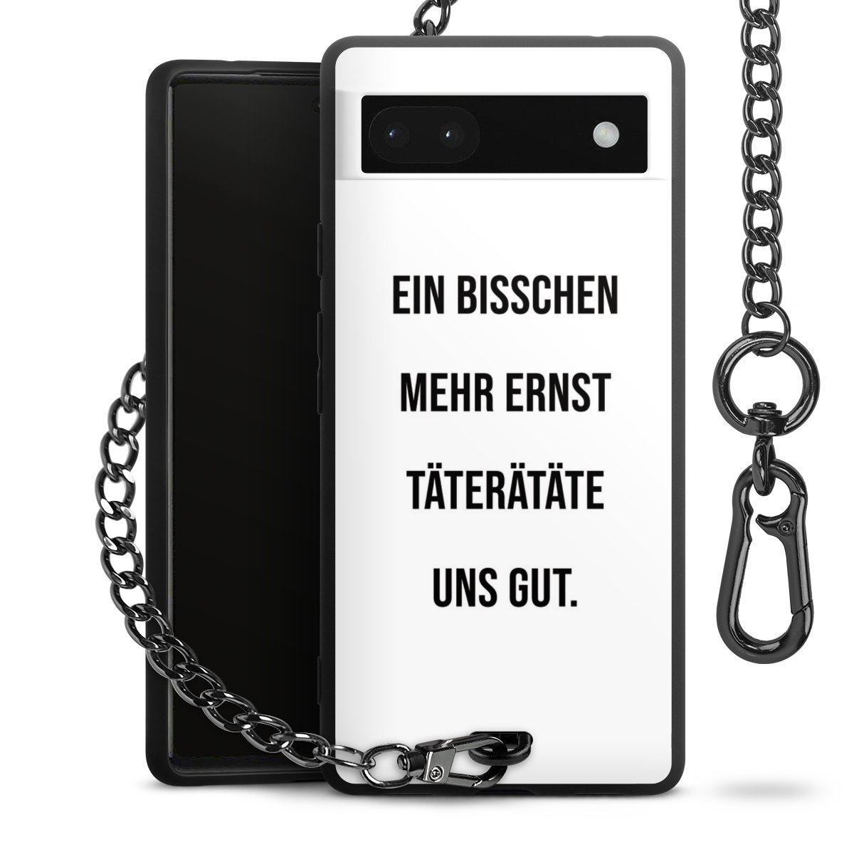 Die mattschwarze Silikon-Handyhülle besteht aus robustem TPU (thermoplastisches Polyurethan). Sie ist flexibel und schützt Dein Smartphone vor Stößen und Kratzern. Die Kette sowie der Karabinerhaken sind aus Metall in Gunmetal-Optik gefertigt. Für dieses Produkt kommen ausschließlich TÜV-geprüfte Materialien zum Einsatz.