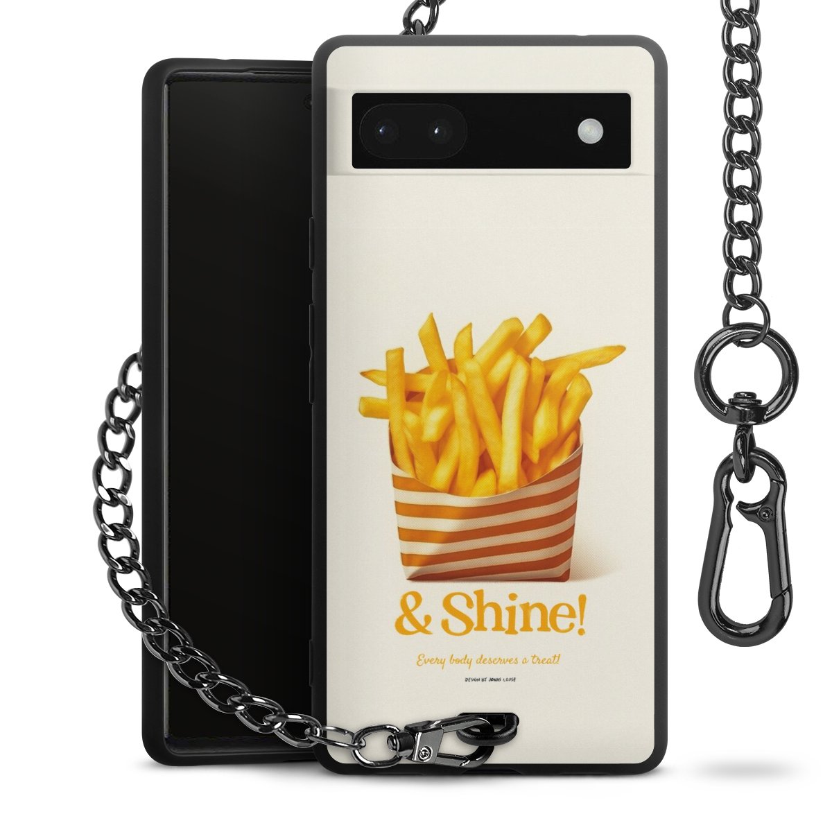 Die Handyhülle verfügt über eine mittig am unteren Rand platzierte Öse, an der die Metallkette stabil befestigt ist. Bestelle die Hülle einfach für Dein Smartphone-Modell, dann passt sie wie angegossen und Du brauchst sie bloß einmal anzudrücken. Handy in die Tasche, Karabiner an den Hosenbund – schon kann die Party starten.