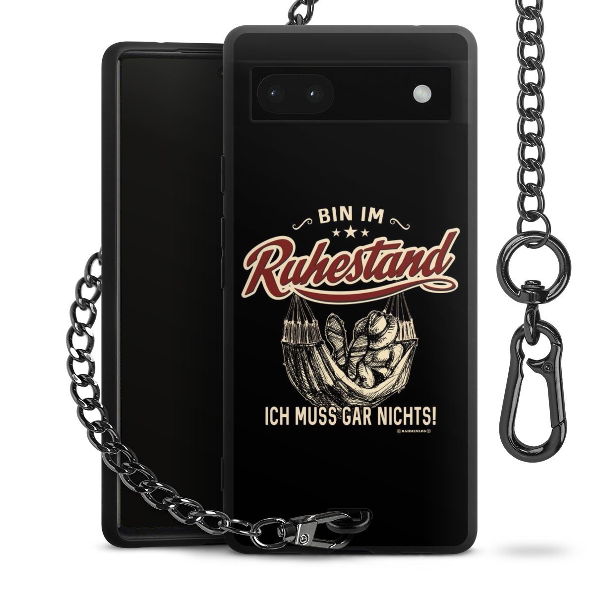 Die mattschwarze Silikon-Handyhülle besteht aus robustem TPU (thermoplastisches Polyurethan). Sie ist flexibel und schützt Dein Smartphone vor Stößen und Kratzern. Die Kette sowie der Karabinerhaken sind aus Metall in Gunmetal-Optik gefertigt. Für dieses Produkt kommen ausschließlich TÜV-geprüfte Materialien zum Einsatz.