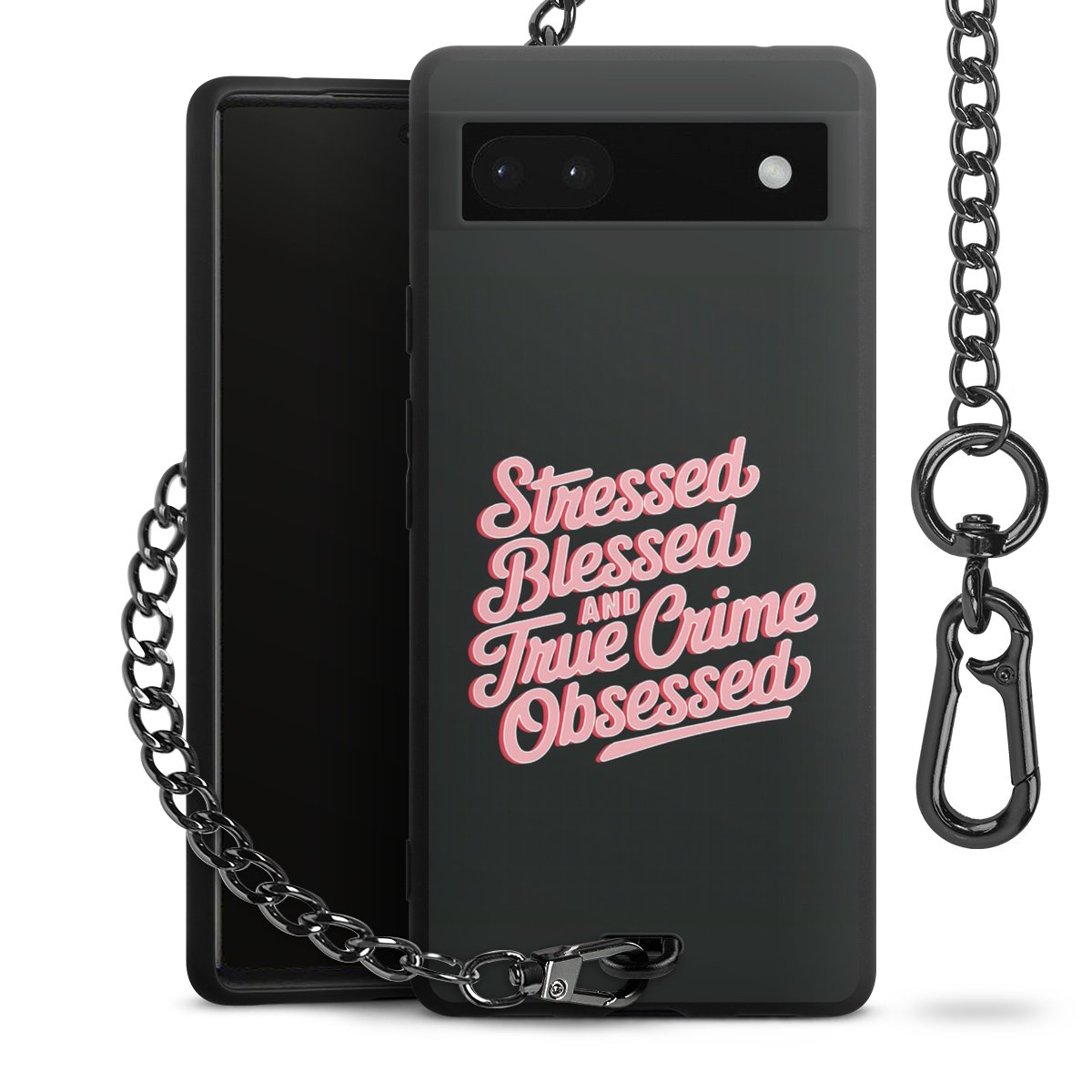Die mattschwarze Silikon-Handyhülle besteht aus robustem TPU (thermoplastisches Polyurethan). Sie ist flexibel und schützt Dein Smartphone vor Stößen und Kratzern. Die Kette sowie der Karabinerhaken sind aus Metall in Gunmetal-Optik gefertigt. Für dieses Produkt kommen ausschließlich TÜV-geprüfte Materialien zum Einsatz.
