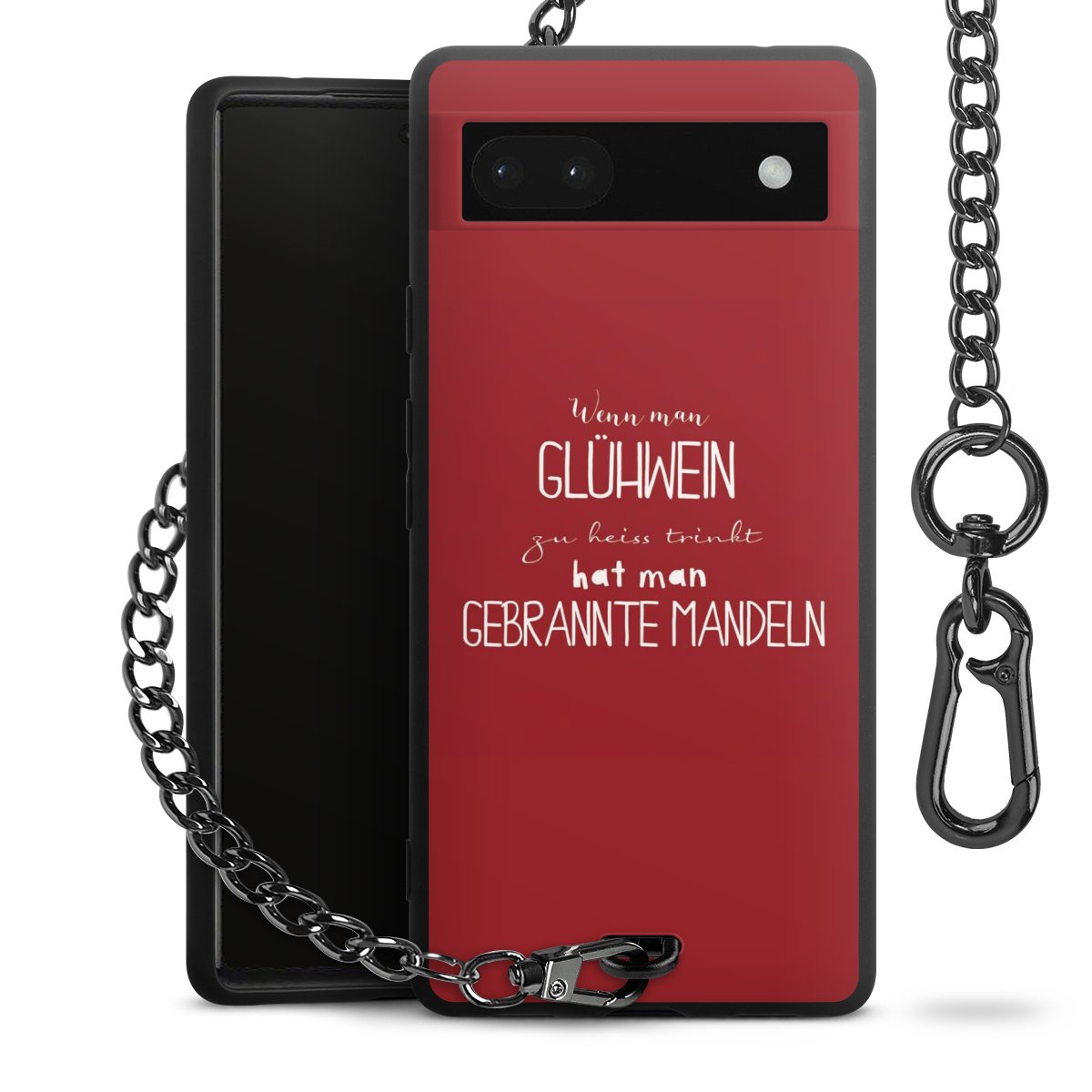 Die mattschwarze Silikon-Handyhülle besteht aus robustem TPU (thermoplastisches Polyurethan). Sie ist flexibel und schützt Dein Smartphone vor Stößen und Kratzern. Die Kette sowie der Karabinerhaken sind aus Metall in Gunmetal-Optik gefertigt. Für dieses Produkt kommen ausschließlich TÜV-geprüfte Materialien zum Einsatz.