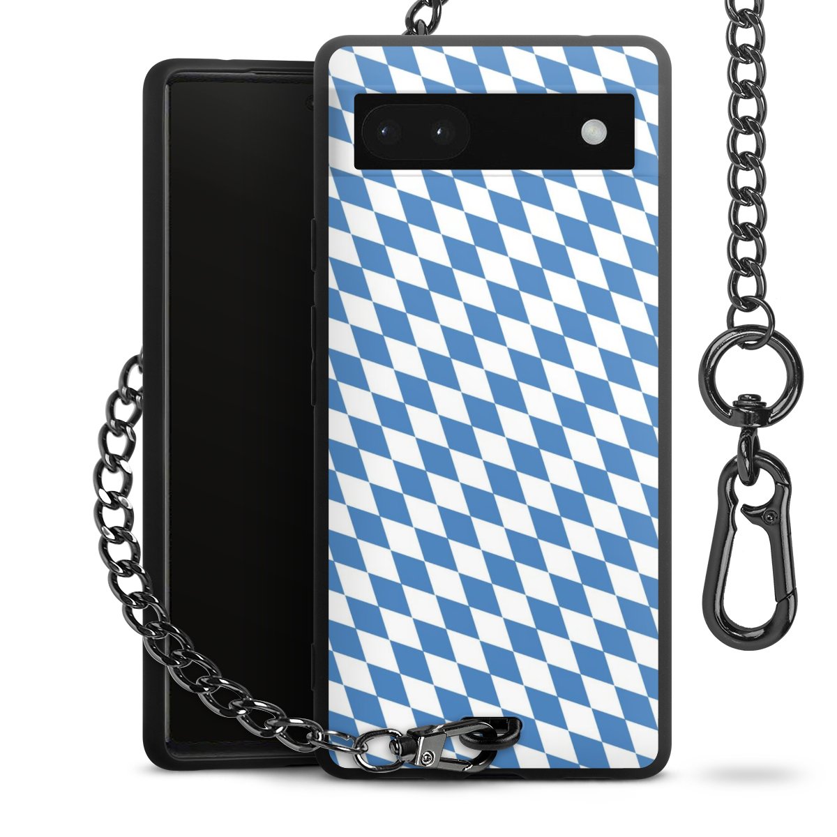 Die mattschwarze Silikon-Handyhülle besteht aus robustem TPU (thermoplastisches Polyurethan). Sie ist flexibel und schützt Dein Smartphone vor Stößen und Kratzern. Die Kette sowie der Karabinerhaken sind aus Metall in Gunmetal-Optik gefertigt. Für dieses Produkt kommen ausschließlich TÜV-geprüfte Materialien zum Einsatz.