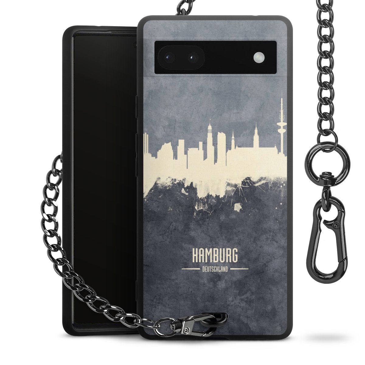Die mattschwarze Silikon-Handyhülle besteht aus robustem TPU (thermoplastisches Polyurethan). Sie ist flexibel und schützt Dein Smartphone vor Stößen und Kratzern. Die Kette sowie der Karabinerhaken sind aus Metall in Gunmetal-Optik gefertigt. Für dieses Produkt kommen ausschließlich TÜV-geprüfte Materialien zum Einsatz.