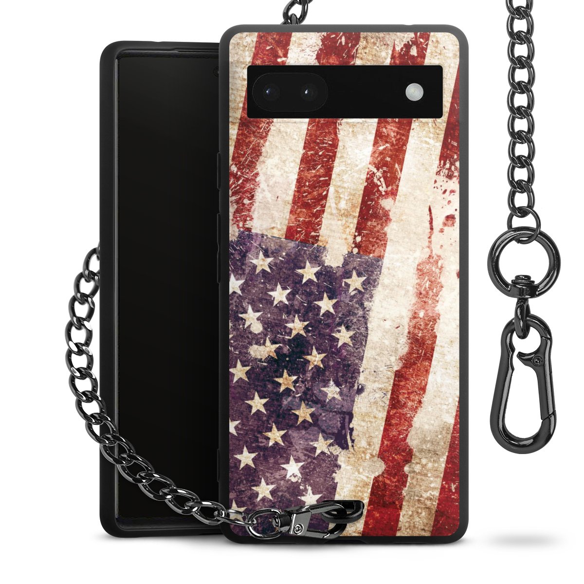 Die mattschwarze Silikon-Handyhülle besteht aus robustem TPU (thermoplastisches Polyurethan). Sie ist flexibel und schützt Dein Smartphone vor Stößen und Kratzern. Die Kette sowie der Karabinerhaken sind aus Metall in Gunmetal-Optik gefertigt. Für dieses Produkt kommen ausschließlich TÜV-geprüfte Materialien zum Einsatz.