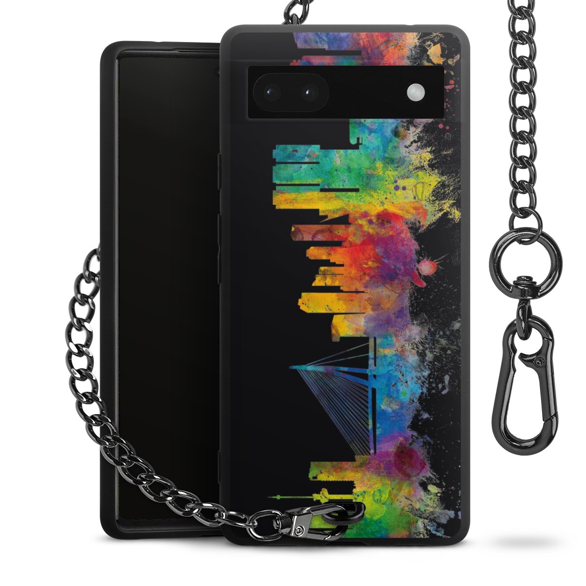 Die mattschwarze Silikon-Handyhülle besteht aus robustem TPU (thermoplastisches Polyurethan). Sie ist flexibel und schützt Dein Smartphone vor Stößen und Kratzern. Die Kette sowie der Karabinerhaken sind aus Metall in Gunmetal-Optik gefertigt. Für dieses Produkt kommen ausschließlich TÜV-geprüfte Materialien zum Einsatz.
