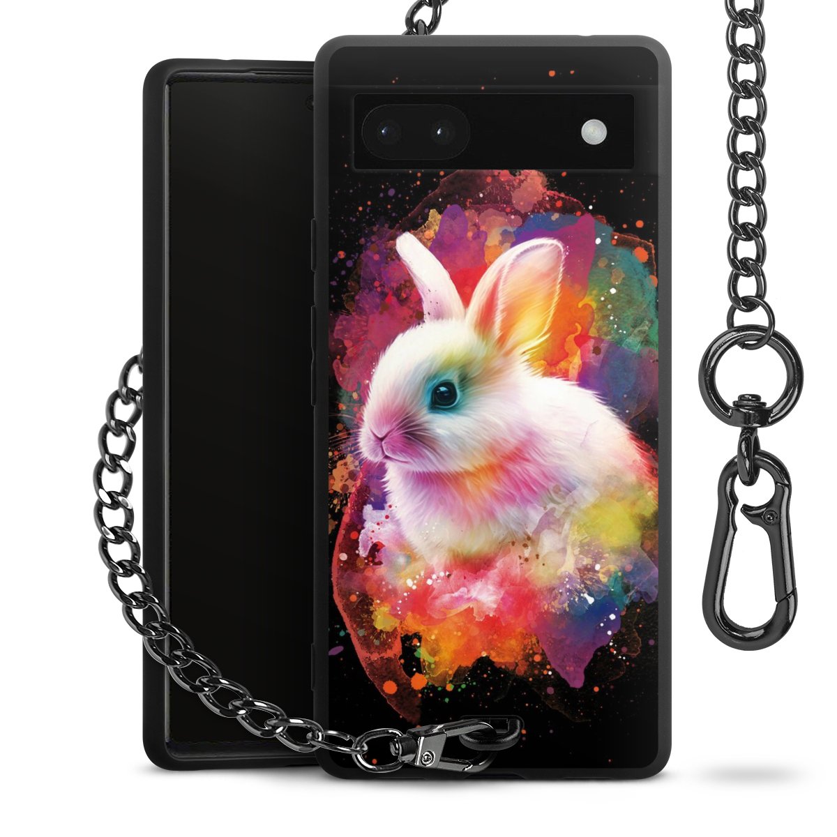 Die Handyhülle verfügt über eine mittig am unteren Rand platzierte Öse, an der die Metallkette stabil befestigt ist. Bestelle die Hülle einfach für Dein Smartphone-Modell, dann passt sie wie angegossen und Du brauchst sie bloß einmal anzudrücken. Handy in die Tasche, Karabiner an den Hosenbund – schon kann die Party starten.