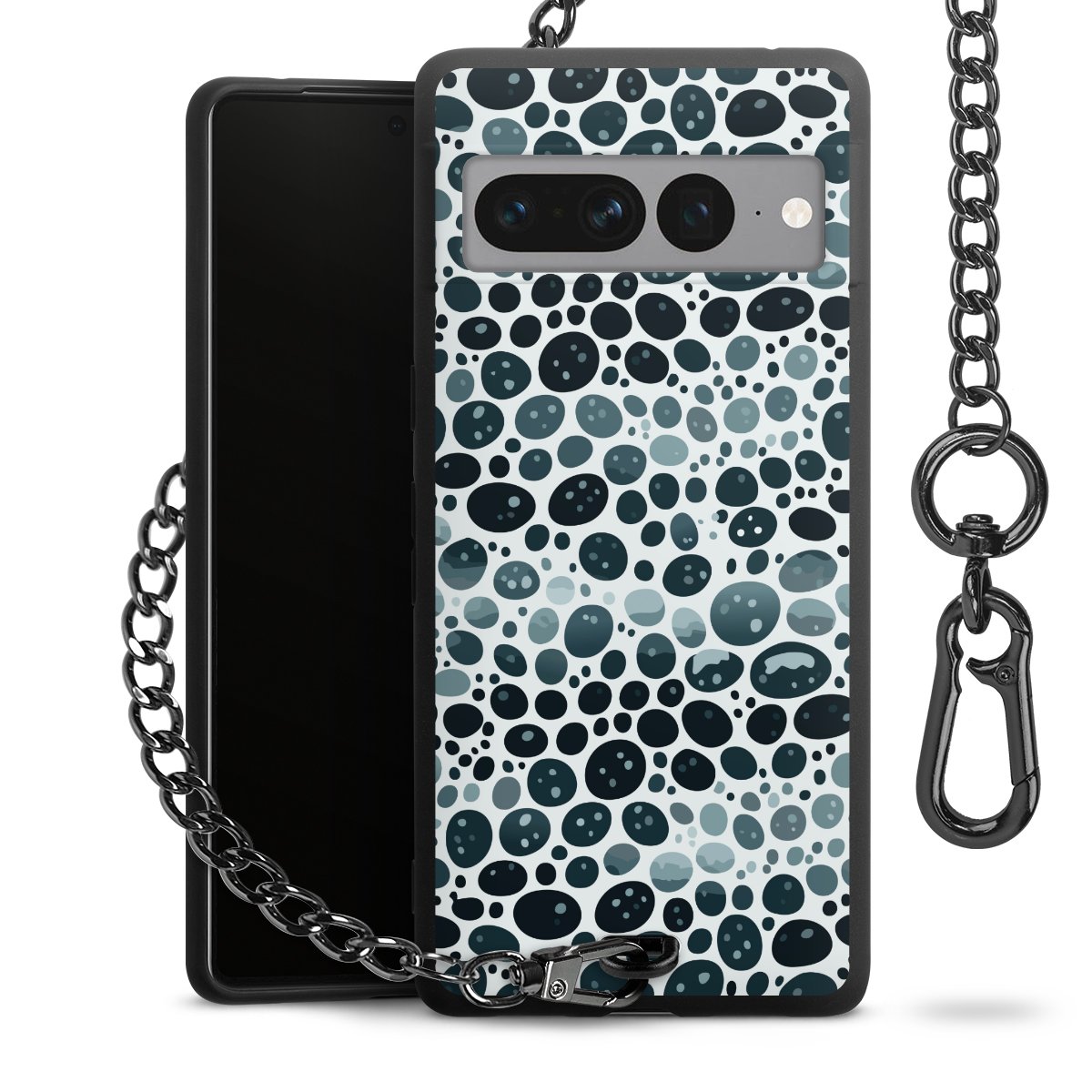 Die mattschwarze Silikon-Handyhülle besteht aus robustem TPU (thermoplastisches Polyurethan). Sie ist flexibel und schützt Dein Smartphone vor Stößen und Kratzern. Die Kette sowie der Karabinerhaken sind aus Metall in Gunmetal-Optik gefertigt. Für dieses Produkt kommen ausschließlich TÜV-geprüfte Materialien zum Einsatz.
