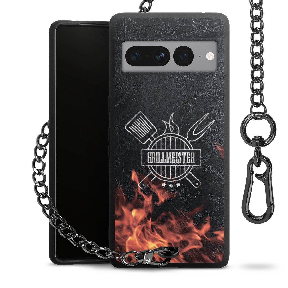 Die mattschwarze Silikon-Handyhülle besteht aus robustem TPU (thermoplastisches Polyurethan). Sie ist flexibel und schützt Dein Smartphone vor Stößen und Kratzern. Die Kette sowie der Karabinerhaken sind aus Metall in Gunmetal-Optik gefertigt. Für dieses Produkt kommen ausschließlich TÜV-geprüfte Materialien zum Einsatz.