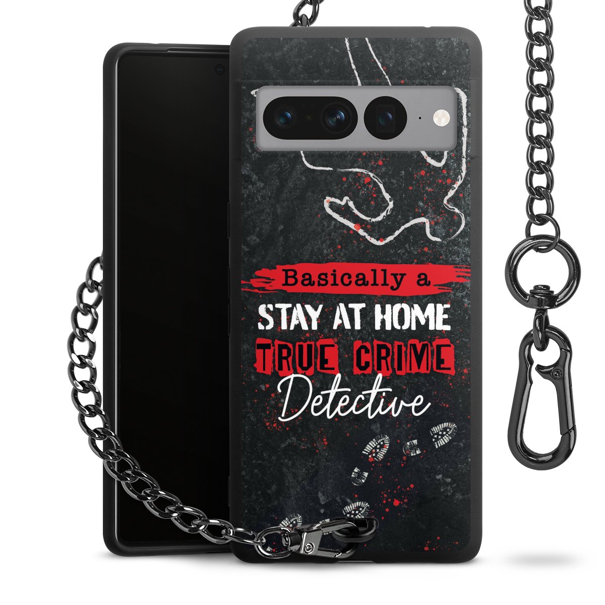 Die mattschwarze Silikon-Handyhülle besteht aus robustem TPU (thermoplastisches Polyurethan). Sie ist flexibel und schützt Dein Smartphone vor Stößen und Kratzern. Die Kette sowie der Karabinerhaken sind aus Metall in Gunmetal-Optik gefertigt. Für dieses Produkt kommen ausschließlich TÜV-geprüfte Materialien zum Einsatz.