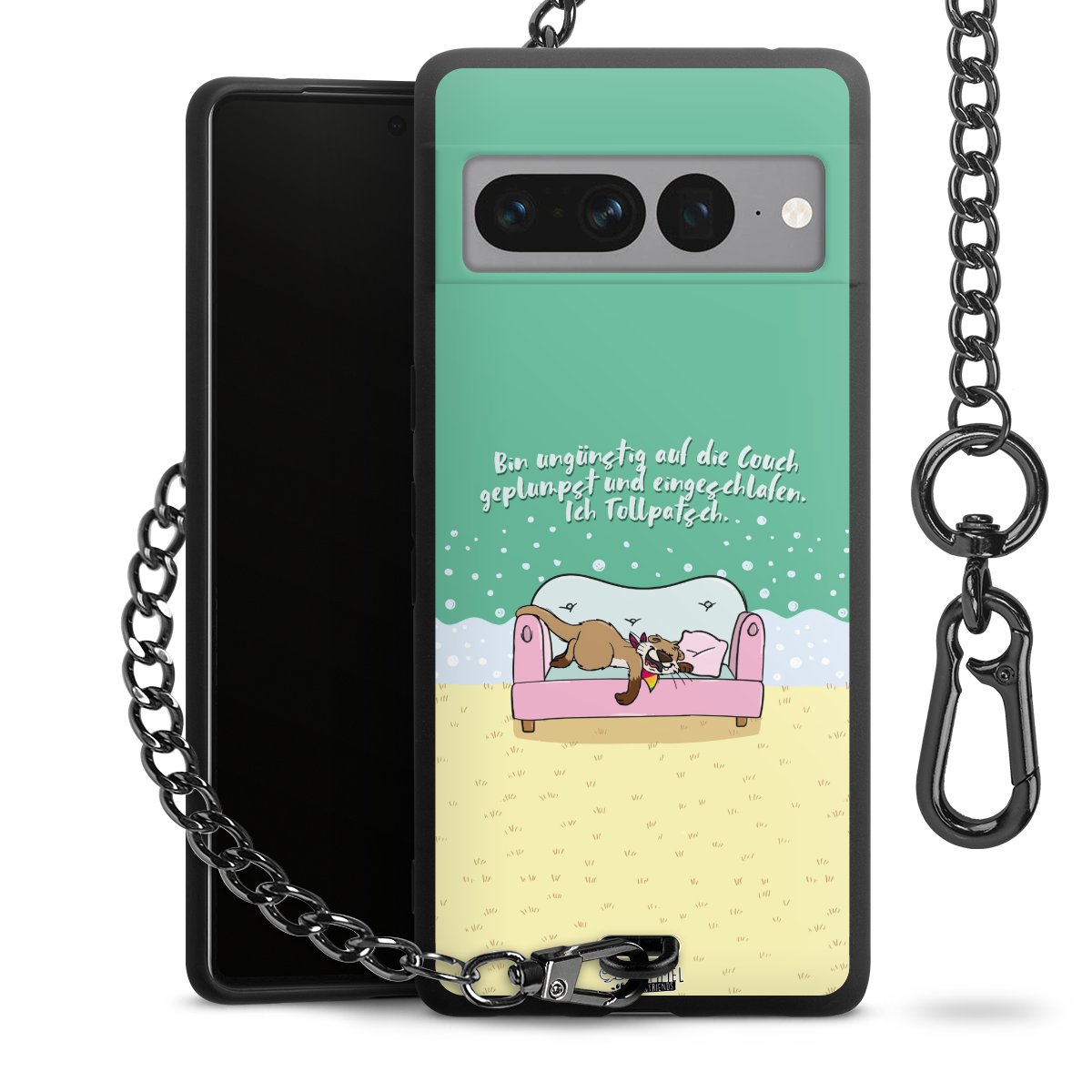 Die mattschwarze Silikon-Handyhülle besteht aus robustem TPU (thermoplastisches Polyurethan). Sie ist flexibel und schützt Dein Smartphone vor Stößen und Kratzern. Die Kette sowie der Karabinerhaken sind aus Metall in Gunmetal-Optik gefertigt. Für dieses Produkt kommen ausschließlich TÜV-geprüfte Materialien zum Einsatz.