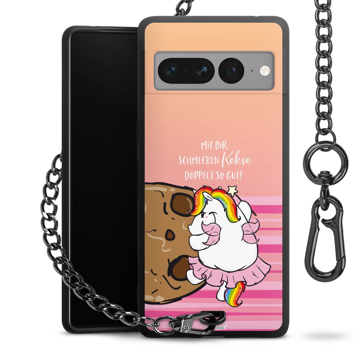 Die mattschwarze Silikon-Handyhülle besteht aus robustem TPU (thermoplastisches Polyurethan). Sie ist flexibel und schützt Dein Smartphone vor Stößen und Kratzern. Die Kette sowie der Karabinerhaken sind aus Metall in Gunmetal-Optik gefertigt. Für dieses Produkt kommen ausschließlich TÜV-geprüfte Materialien zum Einsatz.