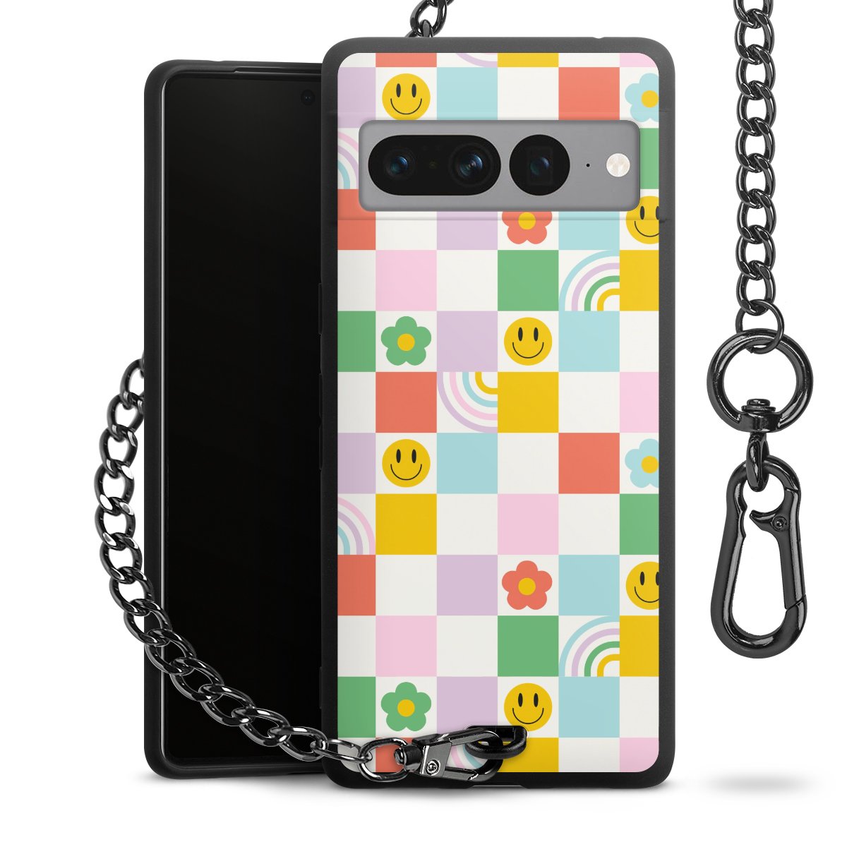 Die mattschwarze Silikon-Handyhülle besteht aus robustem TPU (thermoplastisches Polyurethan). Sie ist flexibel und schützt Dein Smartphone vor Stößen und Kratzern. Die Kette sowie der Karabinerhaken sind aus Metall in Gunmetal-Optik gefertigt. Für dieses Produkt kommen ausschließlich TÜV-geprüfte Materialien zum Einsatz.