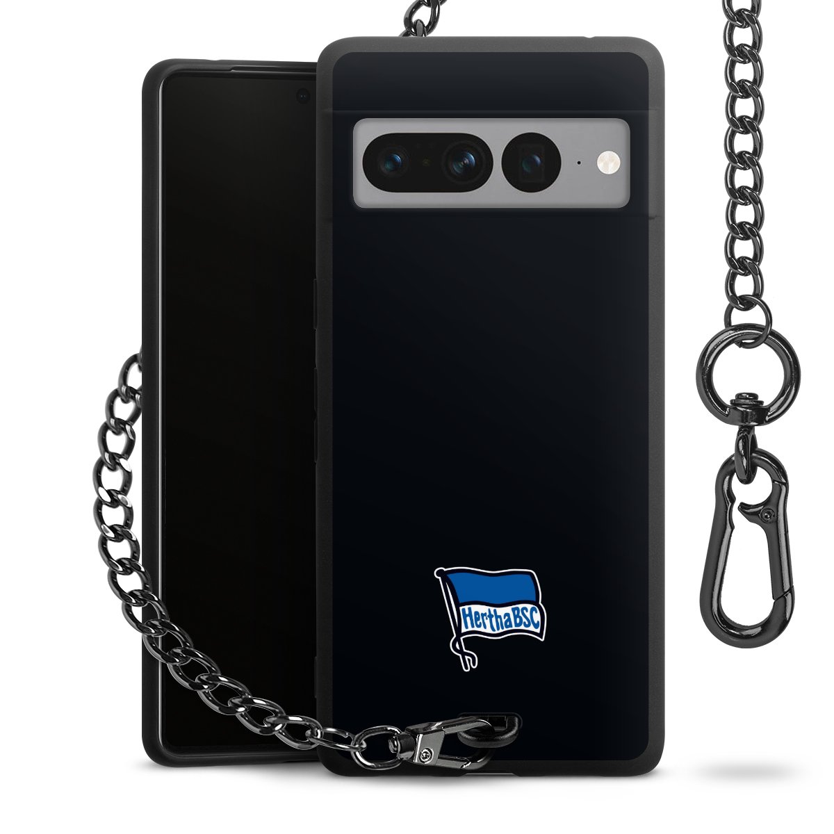 Die mattschwarze Silikon-Handyhülle besteht aus robustem TPU (thermoplastisches Polyurethan). Sie ist flexibel und schützt Dein Smartphone vor Stößen und Kratzern. Die Kette sowie der Karabinerhaken sind aus Metall in Gunmetal-Optik gefertigt. Für dieses Produkt kommen ausschließlich TÜV-geprüfte Materialien zum Einsatz.