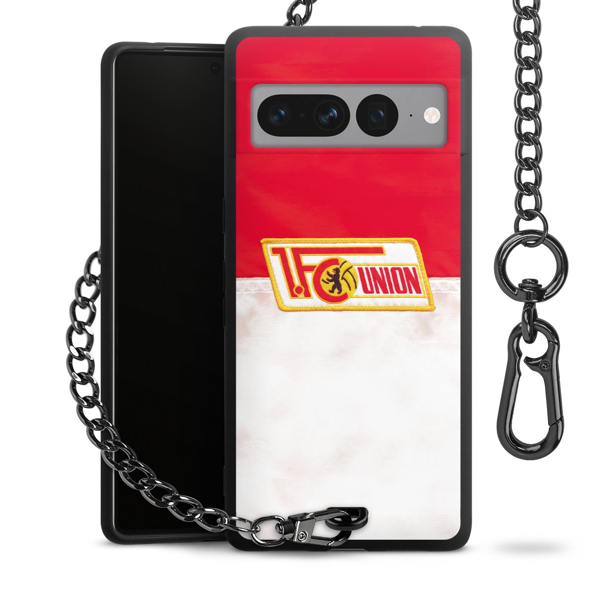 Die Handyhülle verfügt über eine mittig am unteren Rand platzierte Öse, an der die Metallkette stabil befestigt ist. Bestelle die Hülle einfach für Dein Smartphone-Modell, dann passt sie wie angegossen und Du brauchst sie bloß einmal anzudrücken. Handy in die Tasche, Karabiner an den Hosenbund – schon kann die Party starten.