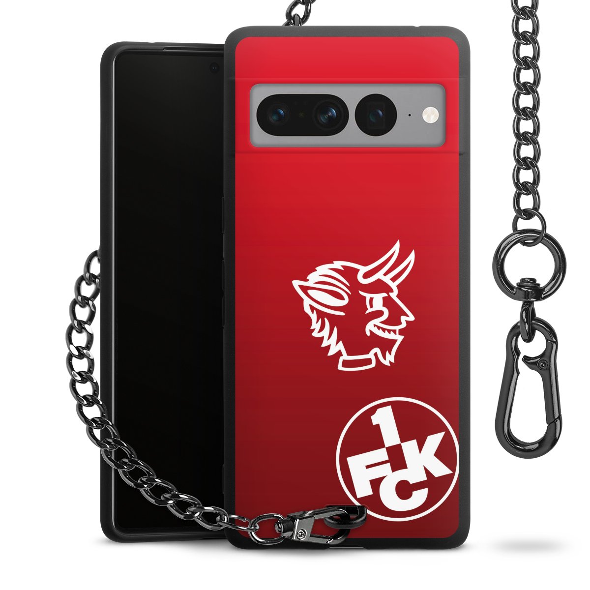 Die Handyhülle verfügt über eine mittig am unteren Rand platzierte Öse, an der die Metallkette stabil befestigt ist. Bestelle die Hülle einfach für Dein Smartphone-Modell, dann passt sie wie angegossen und Du brauchst sie bloß einmal anzudrücken. Handy in die Tasche, Karabiner an den Hosenbund – schon kann die Party starten.