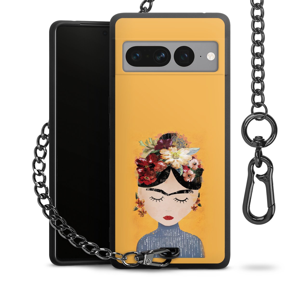 Die mattschwarze Silikon-Handyhülle besteht aus robustem TPU (thermoplastisches Polyurethan). Sie ist flexibel und schützt Dein Smartphone vor Stößen und Kratzern. Die Kette sowie der Karabinerhaken sind aus Metall in Gunmetal-Optik gefertigt. Für dieses Produkt kommen ausschließlich TÜV-geprüfte Materialien zum Einsatz.