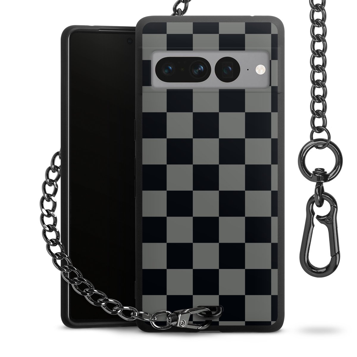 Die mattschwarze Silikon-Handyhülle besteht aus robustem TPU (thermoplastisches Polyurethan). Sie ist flexibel und schützt Dein Smartphone vor Stößen und Kratzern. Die Kette sowie der Karabinerhaken sind aus Metall in Gunmetal-Optik gefertigt. Für dieses Produkt kommen ausschließlich TÜV-geprüfte Materialien zum Einsatz.