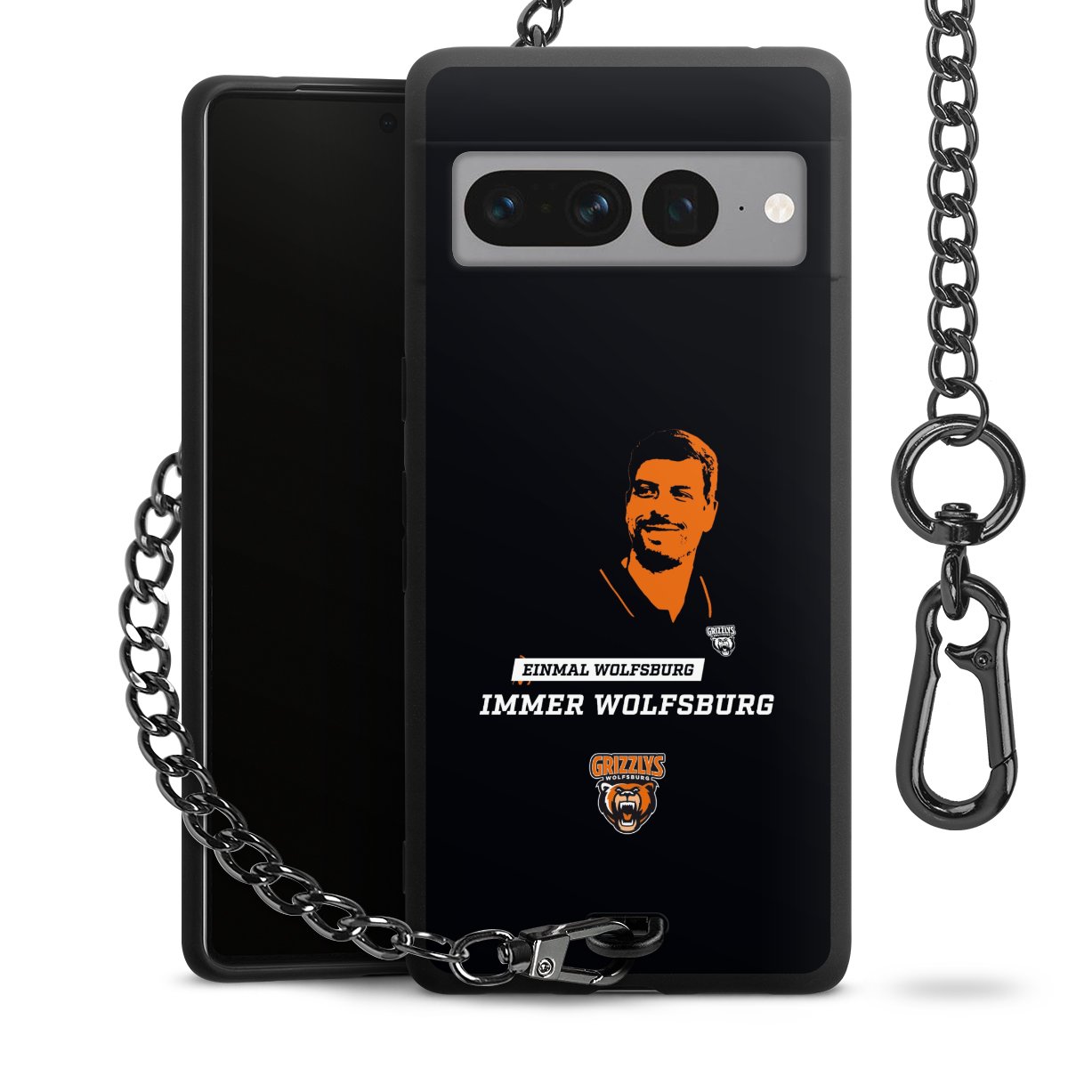 Die mattschwarze Silikon-Handyhülle besteht aus robustem TPU (thermoplastisches Polyurethan). Sie ist flexibel und schützt Dein Smartphone vor Stößen und Kratzern. Die Kette sowie der Karabinerhaken sind aus Metall in Gunmetal-Optik gefertigt. Für dieses Produkt kommen ausschließlich TÜV-geprüfte Materialien zum Einsatz.