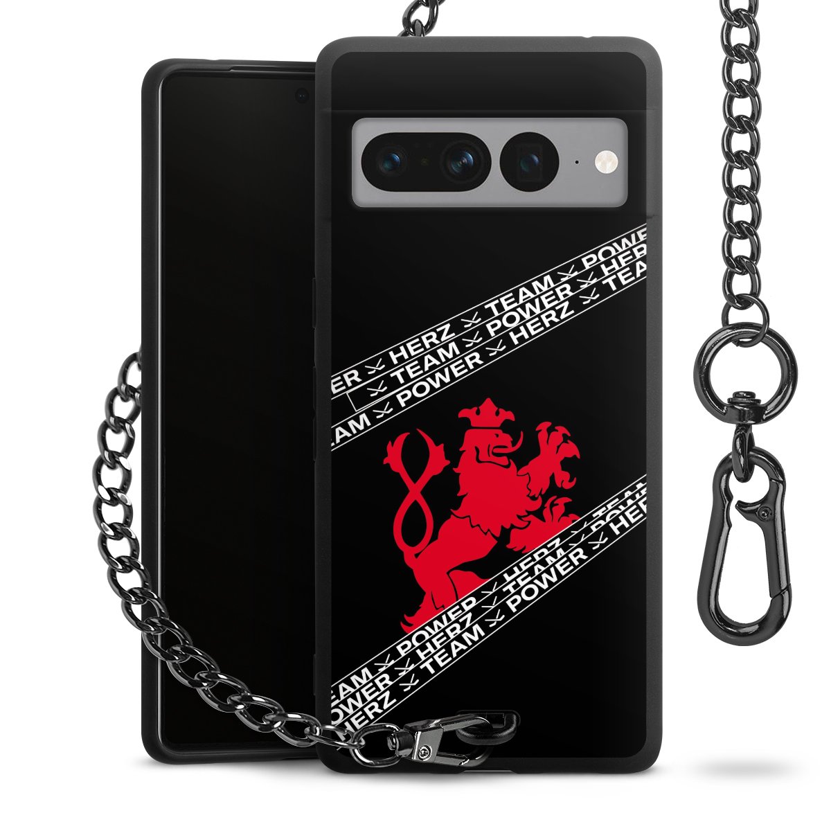 Die mattschwarze Silikon-Handyhülle besteht aus robustem TPU (thermoplastisches Polyurethan). Sie ist flexibel und schützt Dein Smartphone vor Stößen und Kratzern. Die Kette sowie der Karabinerhaken sind aus Metall in Gunmetal-Optik gefertigt. Für dieses Produkt kommen ausschließlich TÜV-geprüfte Materialien zum Einsatz.