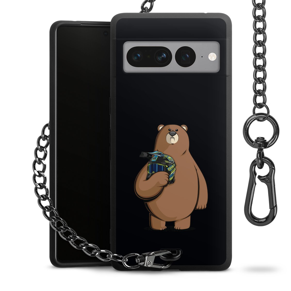 Die mattschwarze Silikon-Handyhülle besteht aus robustem TPU (thermoplastisches Polyurethan). Sie ist flexibel und schützt Dein Smartphone vor Stößen und Kratzern. Die Kette sowie der Karabinerhaken sind aus Metall in Gunmetal-Optik gefertigt. Für dieses Produkt kommen ausschließlich TÜV-geprüfte Materialien zum Einsatz.