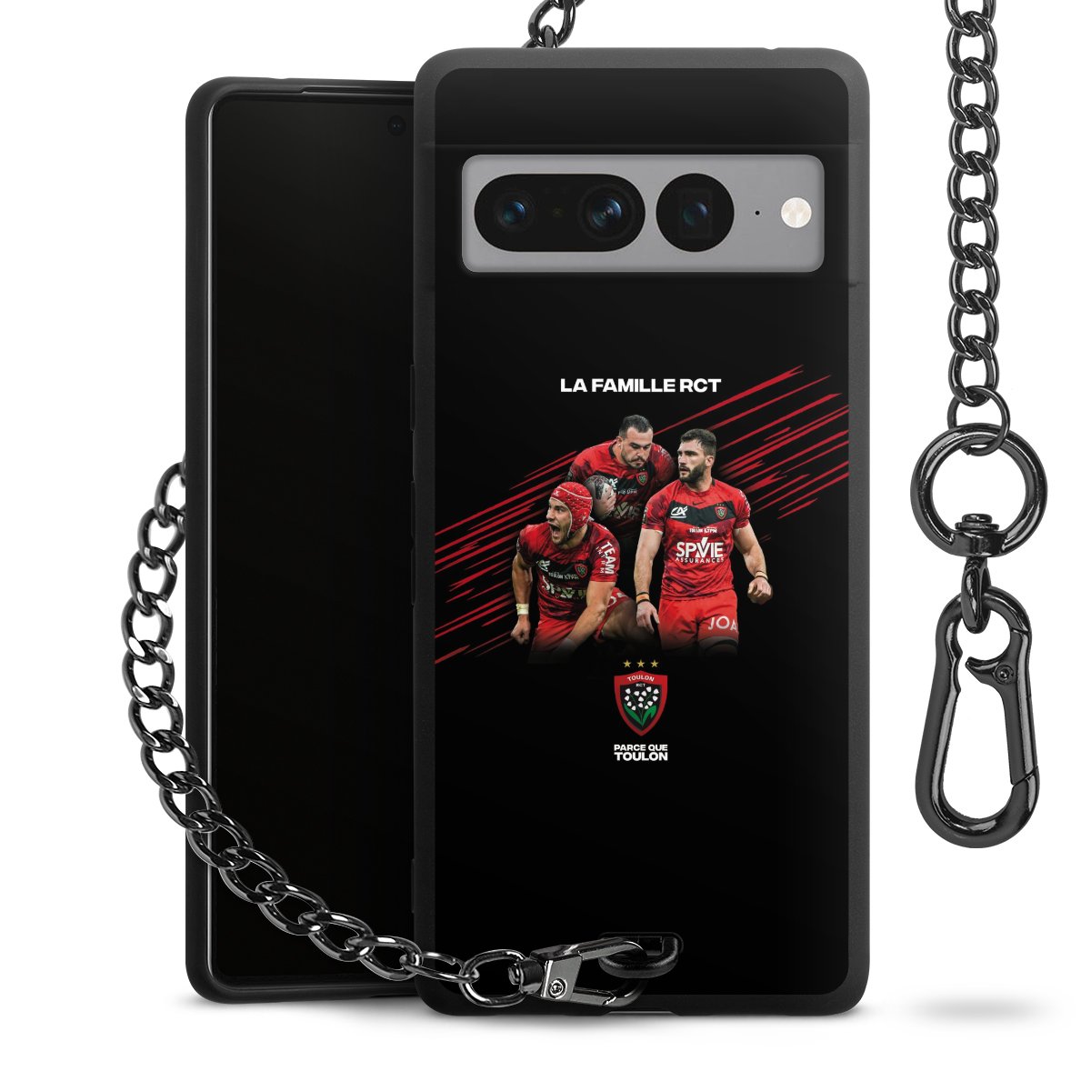 Die mattschwarze Silikon-Handyhülle besteht aus robustem TPU (thermoplastisches Polyurethan). Sie ist flexibel und schützt Dein Smartphone vor Stößen und Kratzern. Die Kette sowie der Karabinerhaken sind aus Metall in Gunmetal-Optik gefertigt. Für dieses Produkt kommen ausschließlich TÜV-geprüfte Materialien zum Einsatz.