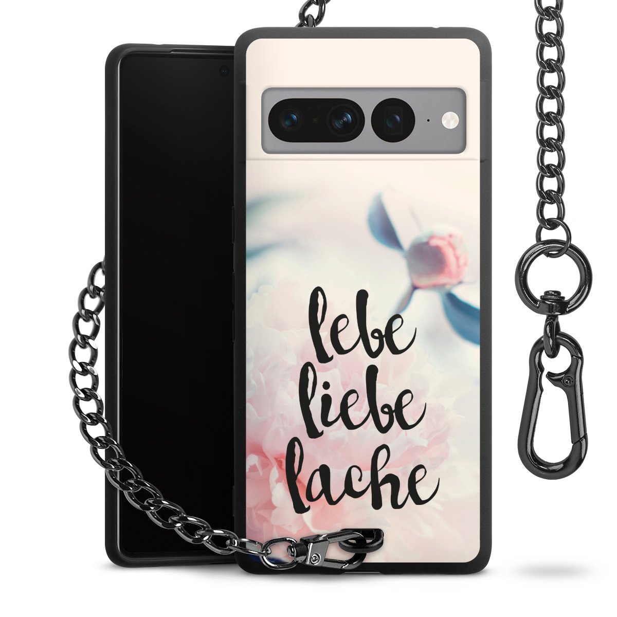 Die mattschwarze Silikon-Handyhülle besteht aus robustem TPU (thermoplastisches Polyurethan). Sie ist flexibel und schützt Dein Smartphone vor Stößen und Kratzern. Die Kette sowie der Karabinerhaken sind aus Metall in Gunmetal-Optik gefertigt. Für dieses Produkt kommen ausschließlich TÜV-geprüfte Materialien zum Einsatz.