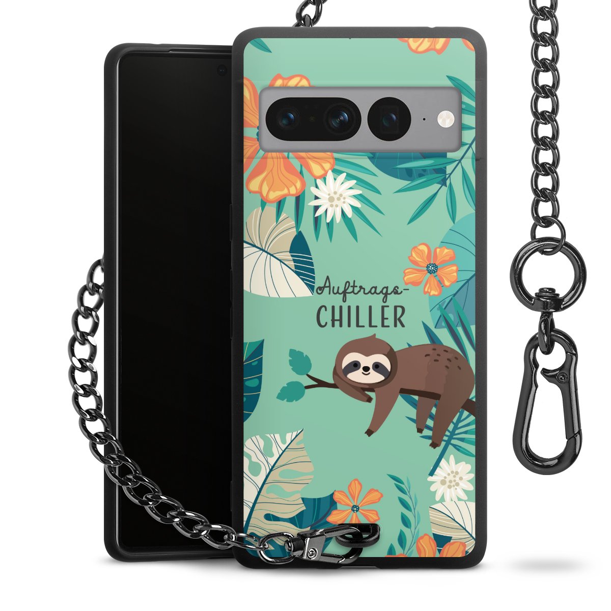 Die mattschwarze Silikon-Handyhülle besteht aus robustem TPU (thermoplastisches Polyurethan). Sie ist flexibel und schützt Dein Smartphone vor Stößen und Kratzern. Die Kette sowie der Karabinerhaken sind aus Metall in Gunmetal-Optik gefertigt. Für dieses Produkt kommen ausschließlich TÜV-geprüfte Materialien zum Einsatz.