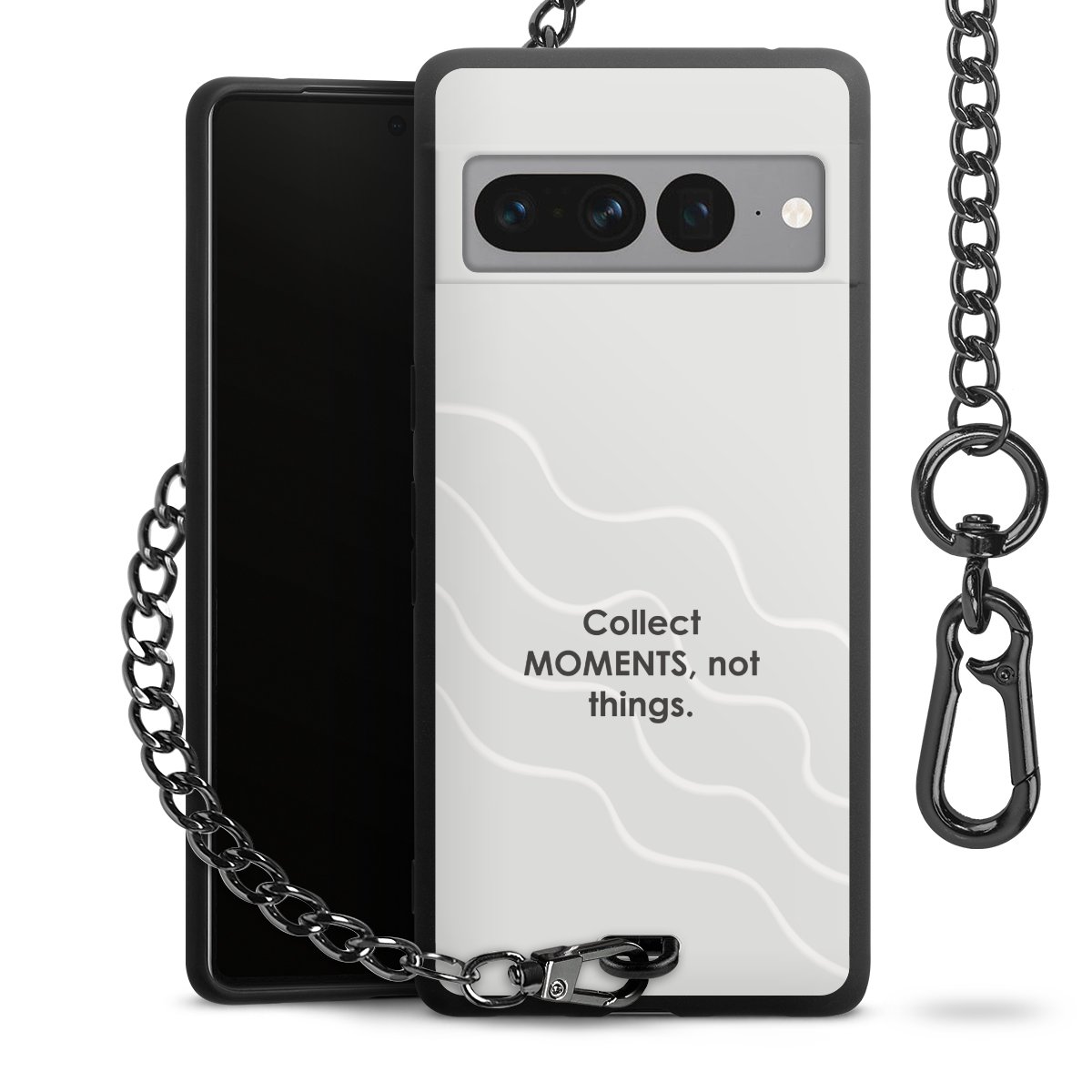 Die mattschwarze Silikon-Handyhülle besteht aus robustem TPU (thermoplastisches Polyurethan). Sie ist flexibel und schützt Dein Smartphone vor Stößen und Kratzern. Die Kette sowie der Karabinerhaken sind aus Metall in Gunmetal-Optik gefertigt. Für dieses Produkt kommen ausschließlich TÜV-geprüfte Materialien zum Einsatz.
