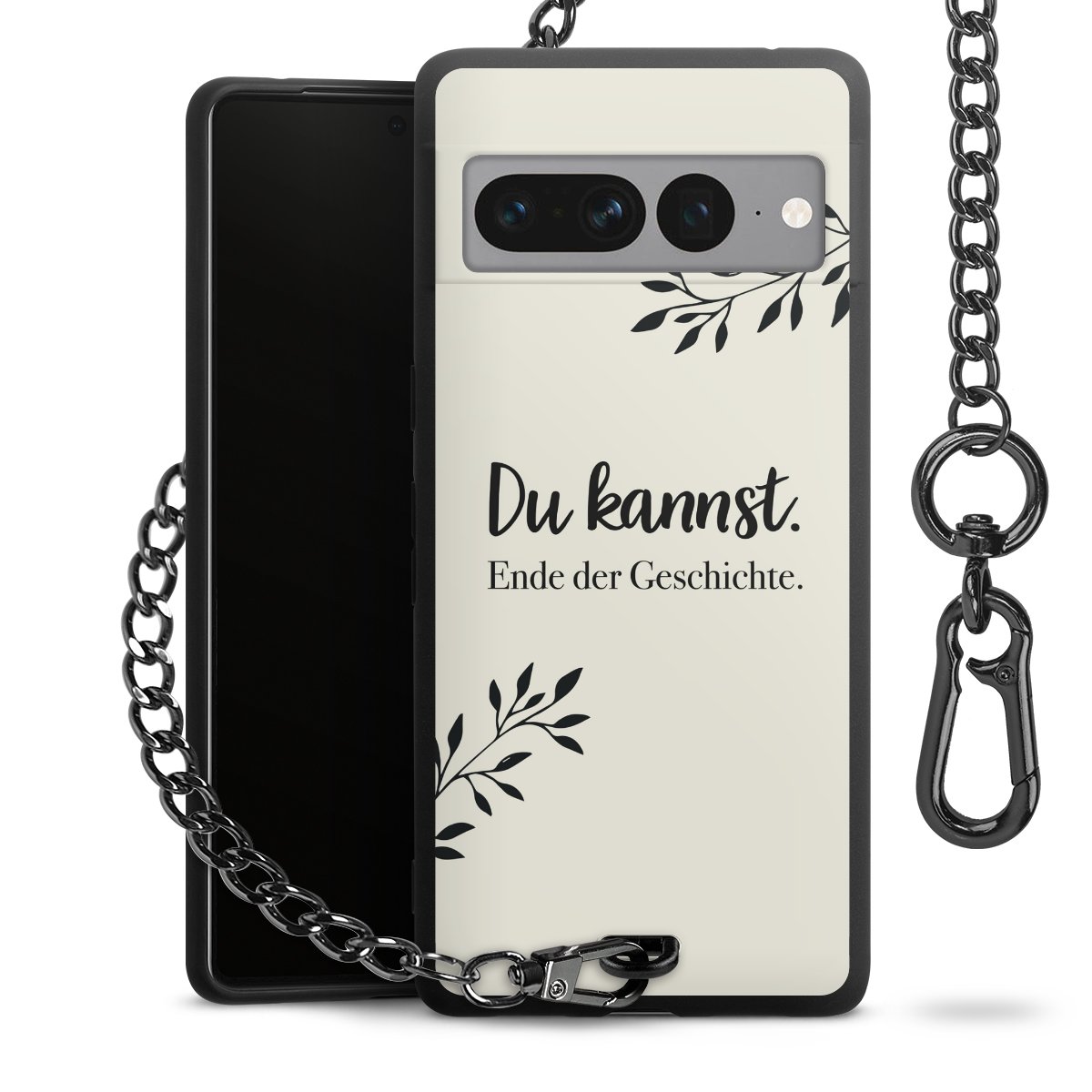 Die mattschwarze Silikon-Handyhülle besteht aus robustem TPU (thermoplastisches Polyurethan). Sie ist flexibel und schützt Dein Smartphone vor Stößen und Kratzern. Die Kette sowie der Karabinerhaken sind aus Metall in Gunmetal-Optik gefertigt. Für dieses Produkt kommen ausschließlich TÜV-geprüfte Materialien zum Einsatz.