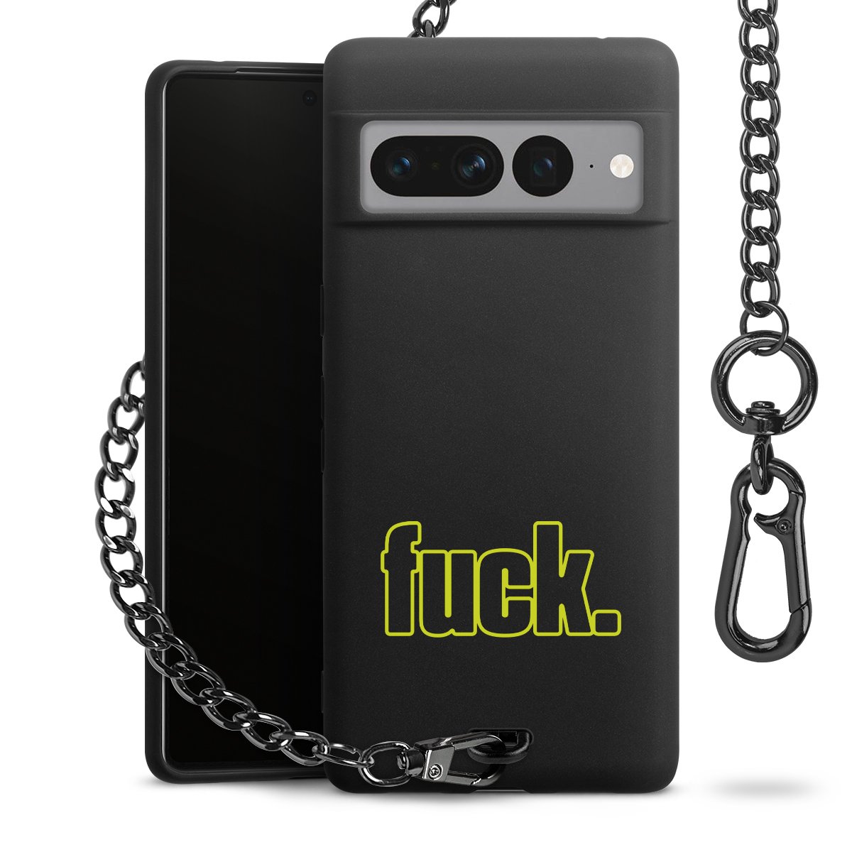 Die mattschwarze Silikon-Handyhülle besteht aus robustem TPU (thermoplastisches Polyurethan). Sie ist flexibel und schützt Dein Smartphone vor Stößen und Kratzern. Die Kette sowie der Karabinerhaken sind aus Metall in Gunmetal-Optik gefertigt. Für dieses Produkt kommen ausschließlich TÜV-geprüfte Materialien zum Einsatz.