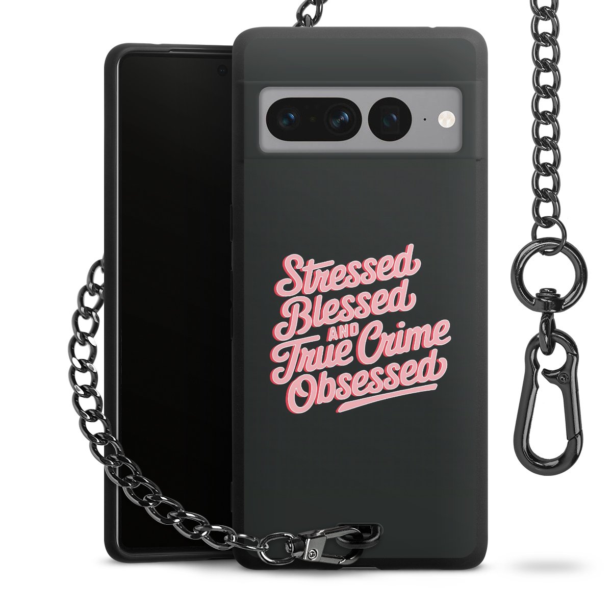 Die mattschwarze Silikon-Handyhülle besteht aus robustem TPU (thermoplastisches Polyurethan). Sie ist flexibel und schützt Dein Smartphone vor Stößen und Kratzern. Die Kette sowie der Karabinerhaken sind aus Metall in Gunmetal-Optik gefertigt. Für dieses Produkt kommen ausschließlich TÜV-geprüfte Materialien zum Einsatz.