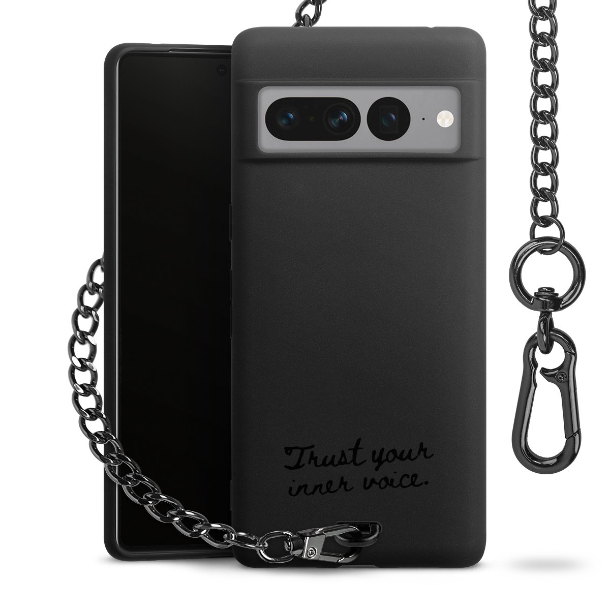 Die mattschwarze Silikon-Handyhülle besteht aus robustem TPU (thermoplastisches Polyurethan). Sie ist flexibel und schützt Dein Smartphone vor Stößen und Kratzern. Die Kette sowie der Karabinerhaken sind aus Metall in Gunmetal-Optik gefertigt. Für dieses Produkt kommen ausschließlich TÜV-geprüfte Materialien zum Einsatz.