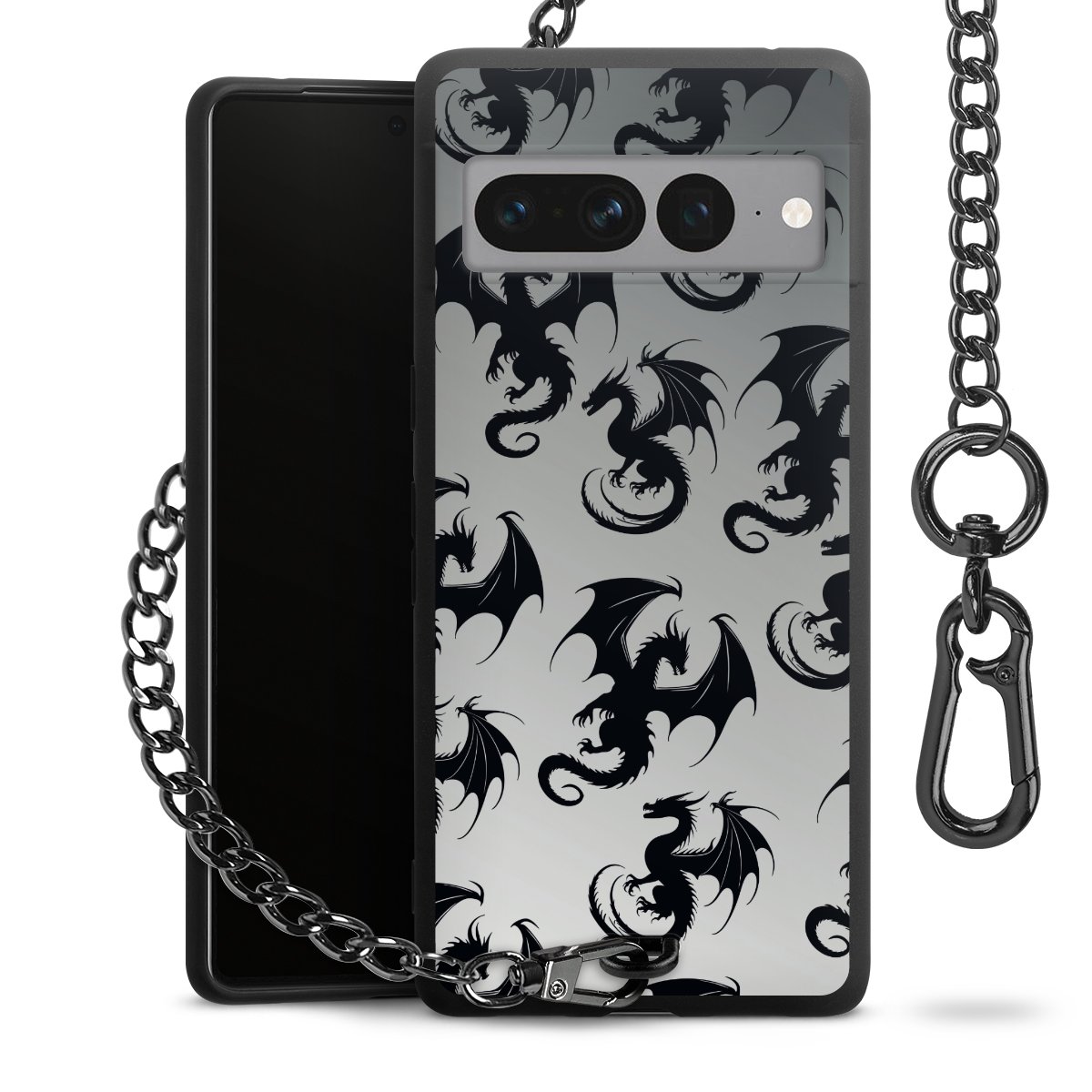 Die mattschwarze Silikon-Handyhülle besteht aus robustem TPU (thermoplastisches Polyurethan). Sie ist flexibel und schützt Dein Smartphone vor Stößen und Kratzern. Die Kette sowie der Karabinerhaken sind aus Metall in Gunmetal-Optik gefertigt. Für dieses Produkt kommen ausschließlich TÜV-geprüfte Materialien zum Einsatz.