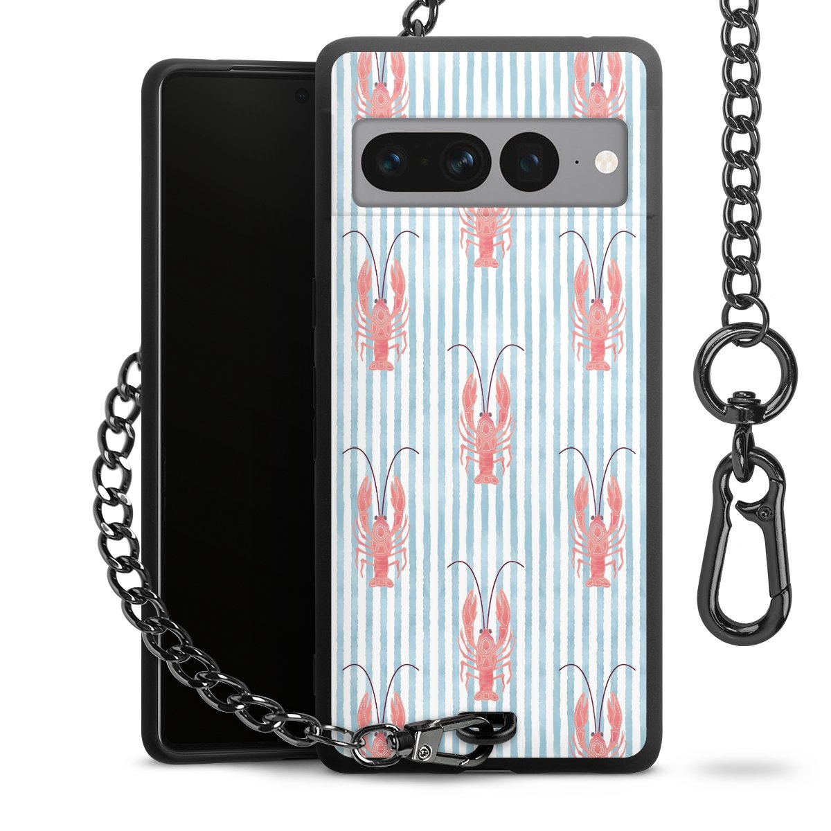 Die Handyhülle verfügt über eine mittig am unteren Rand platzierte Öse, an der die Metallkette stabil befestigt ist. Bestelle die Hülle einfach für Dein Smartphone-Modell, dann passt sie wie angegossen und Du brauchst sie bloß einmal anzudrücken. Handy in die Tasche, Karabiner an den Hosenbund – schon kann die Party starten.