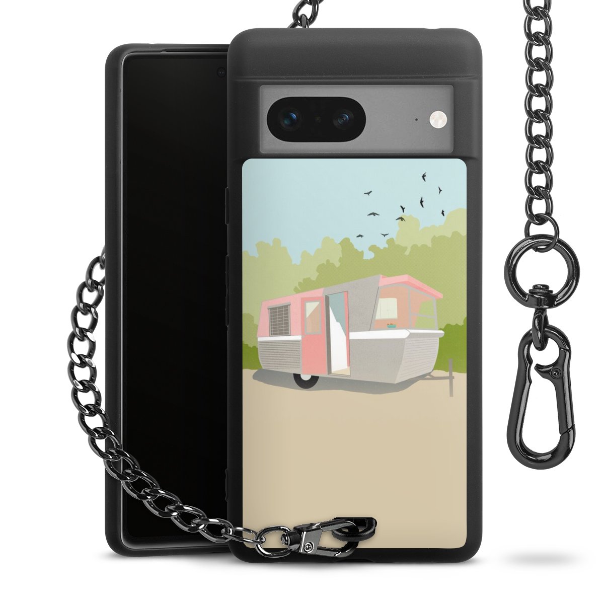 Die mattschwarze Silikon-Handyhülle besteht aus robustem TPU (thermoplastisches Polyurethan). Sie ist flexibel und schützt Dein Smartphone vor Stößen und Kratzern. Die Kette sowie der Karabinerhaken sind aus Metall in Gunmetal-Optik gefertigt. Für dieses Produkt kommen ausschließlich TÜV-geprüfte Materialien zum Einsatz.