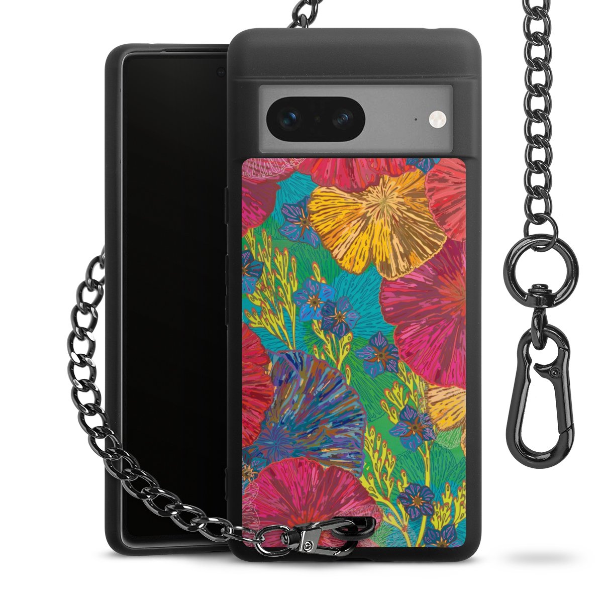 Die mattschwarze Silikon-Handyhülle besteht aus robustem TPU (thermoplastisches Polyurethan). Sie ist flexibel und schützt Dein Smartphone vor Stößen und Kratzern. Die Kette sowie der Karabinerhaken sind aus Metall in Gunmetal-Optik gefertigt. Für dieses Produkt kommen ausschließlich TÜV-geprüfte Materialien zum Einsatz.