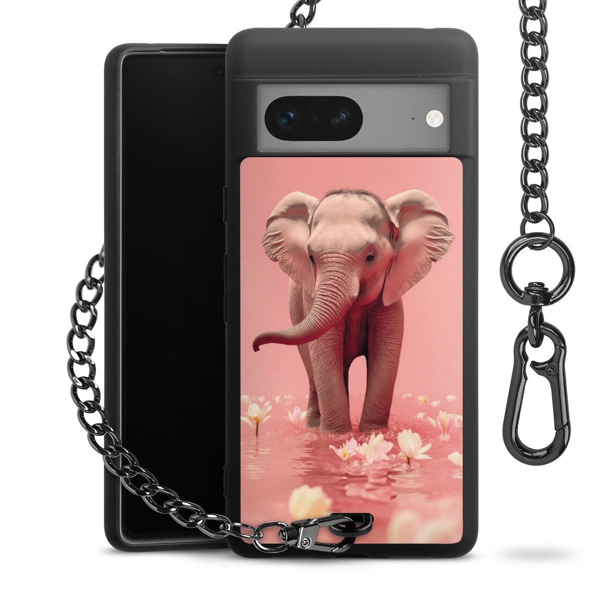 Die Handyhülle verfügt über eine mittig am unteren Rand platzierte Öse, an der die Metallkette stabil befestigt ist. Bestelle die Hülle einfach für Dein Smartphone-Modell, dann passt sie wie angegossen und Du brauchst sie bloß einmal anzudrücken. Handy in die Tasche, Karabiner an den Hosenbund – schon kann die Party starten.