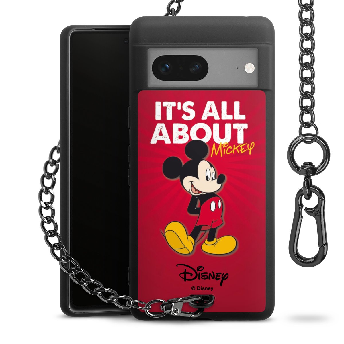 Die Handyhülle verfügt über eine mittig am unteren Rand platzierte Öse, an der die Metallkette stabil befestigt ist. Bestelle die Hülle einfach für Dein Smartphone-Modell, dann passt sie wie angegossen und Du brauchst sie bloß einmal anzudrücken. Handy in die Tasche, Karabiner an den Hosenbund – schon kann die Party starten.