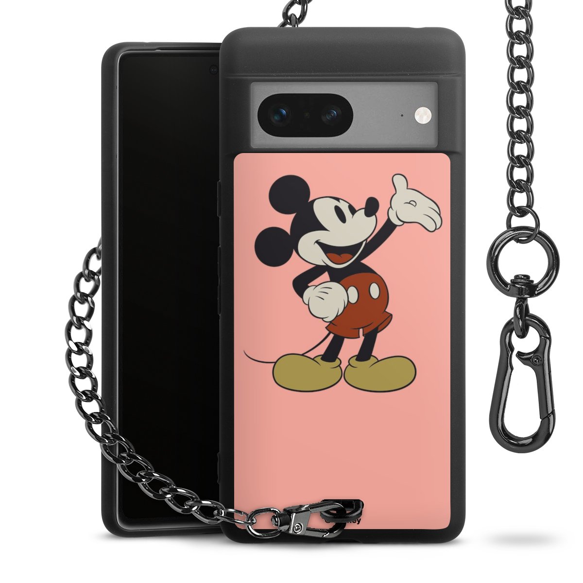 Die Handyhülle verfügt über eine mittig am unteren Rand platzierte Öse, an der die Metallkette stabil befestigt ist. Bestelle die Hülle einfach für Dein Smartphone-Modell, dann passt sie wie angegossen und Du brauchst sie bloß einmal anzudrücken. Handy in die Tasche, Karabiner an den Hosenbund – schon kann die Party starten.