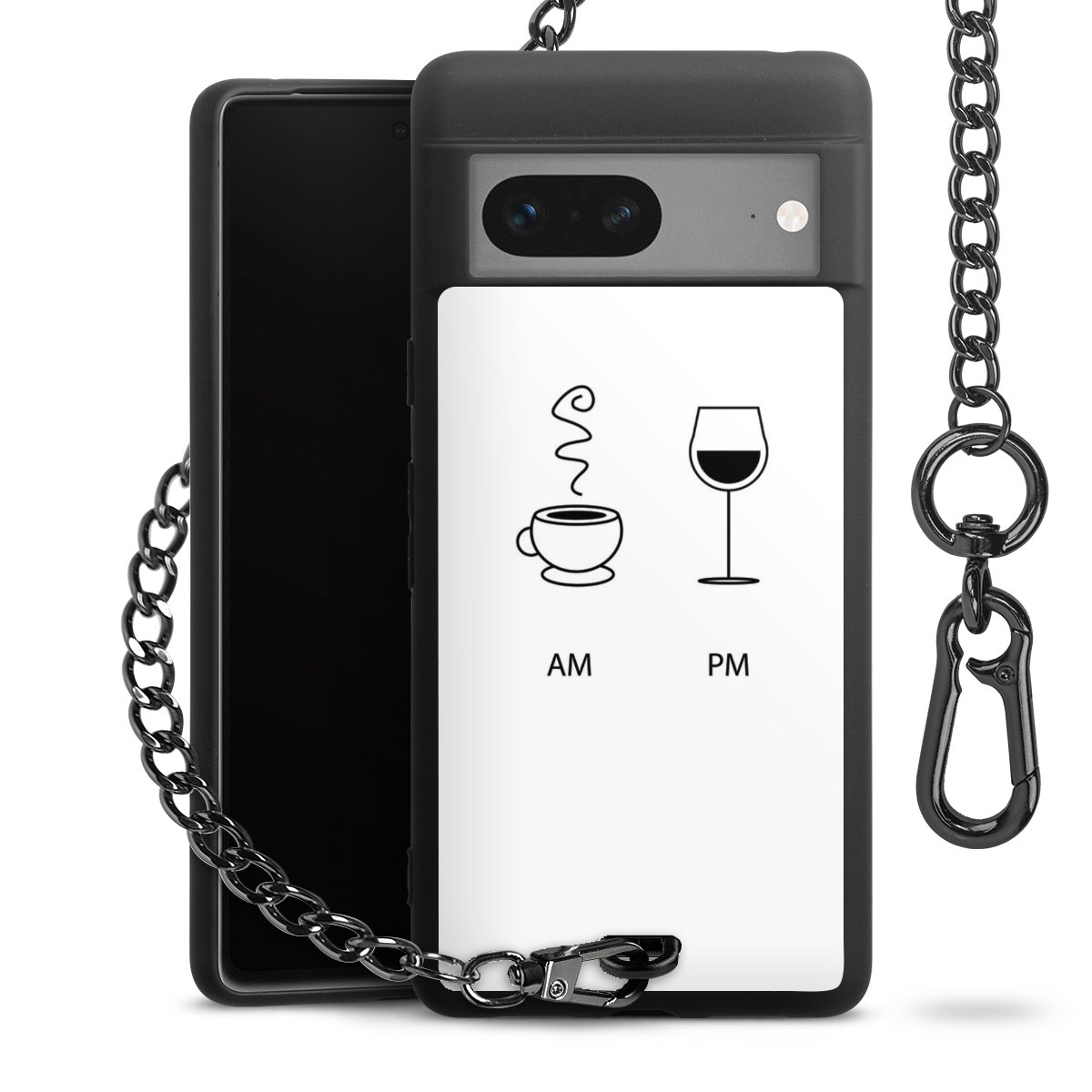 Die mattschwarze Silikon-Handyhülle besteht aus robustem TPU (thermoplastisches Polyurethan). Sie ist flexibel und schützt Dein Smartphone vor Stößen und Kratzern. Die Kette sowie der Karabinerhaken sind aus Metall in Gunmetal-Optik gefertigt. Für dieses Produkt kommen ausschließlich TÜV-geprüfte Materialien zum Einsatz.